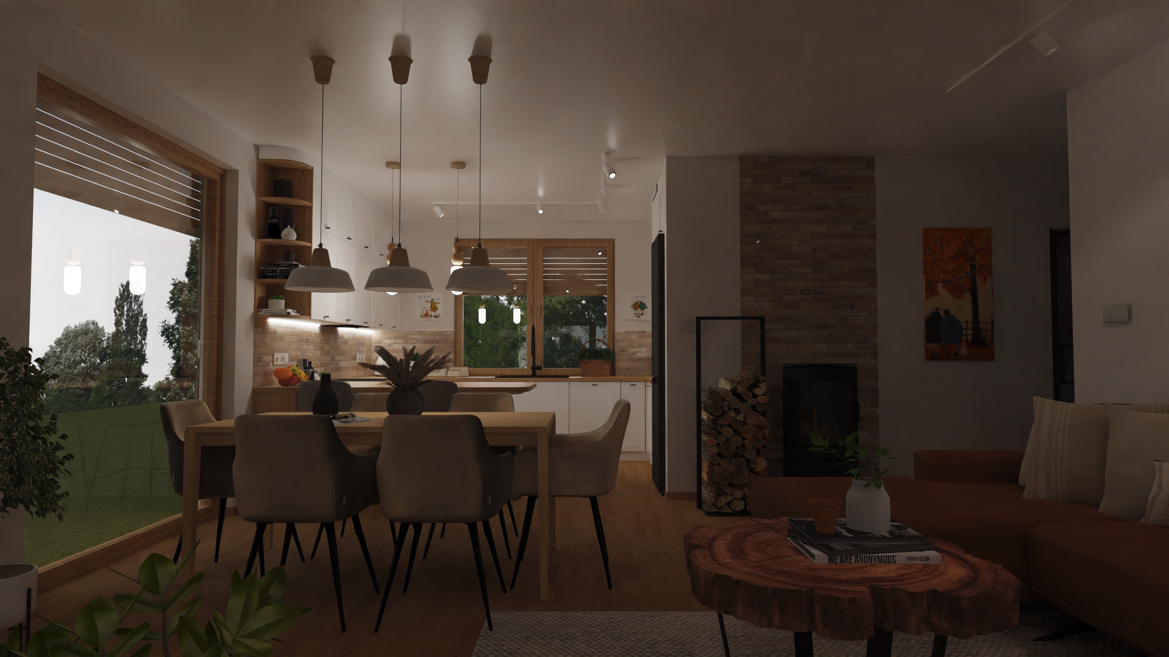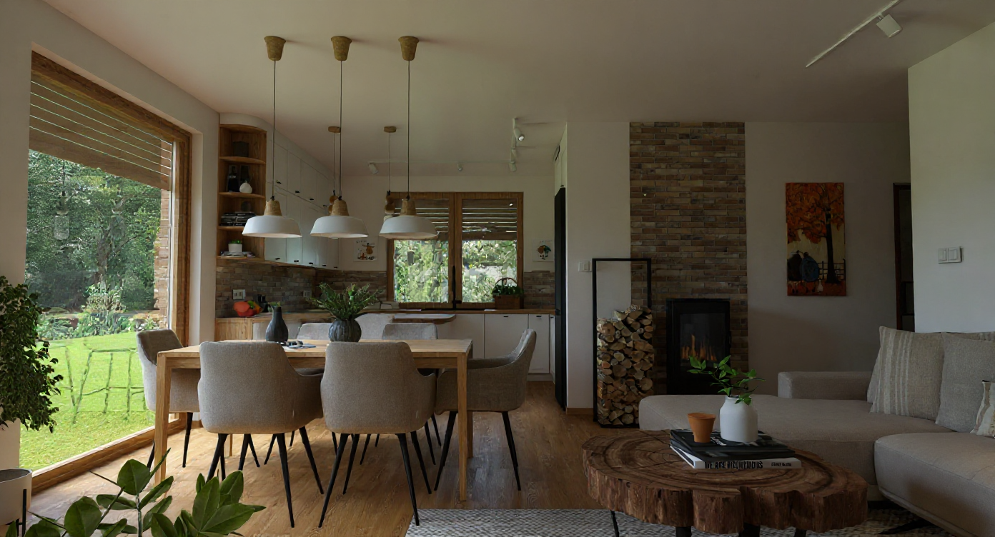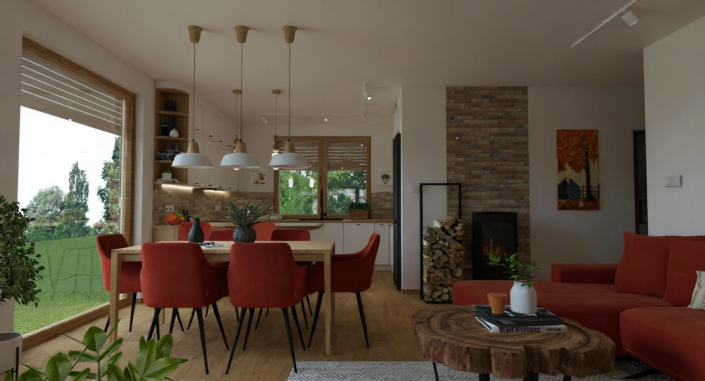 transform this picture into a realistic interior visualization with natural light keep the camera angle keep the original materials and textures and colours make it an ultradetailed view with global illumination and photo based rendering materials add a little sunlight and contrast