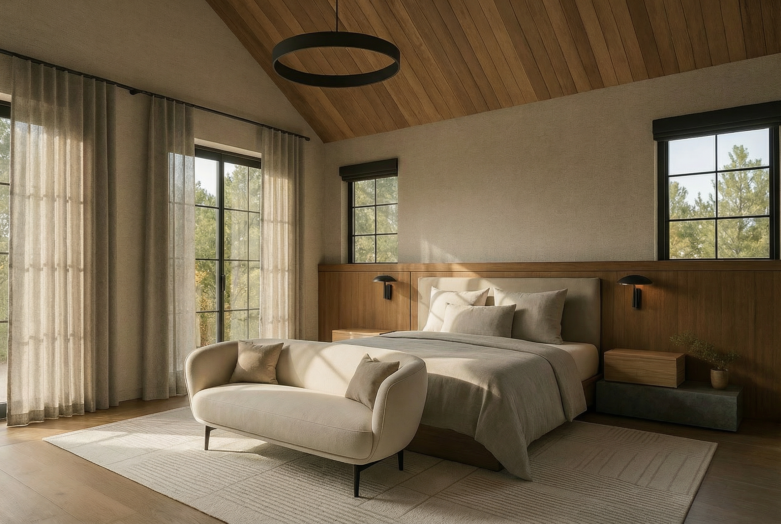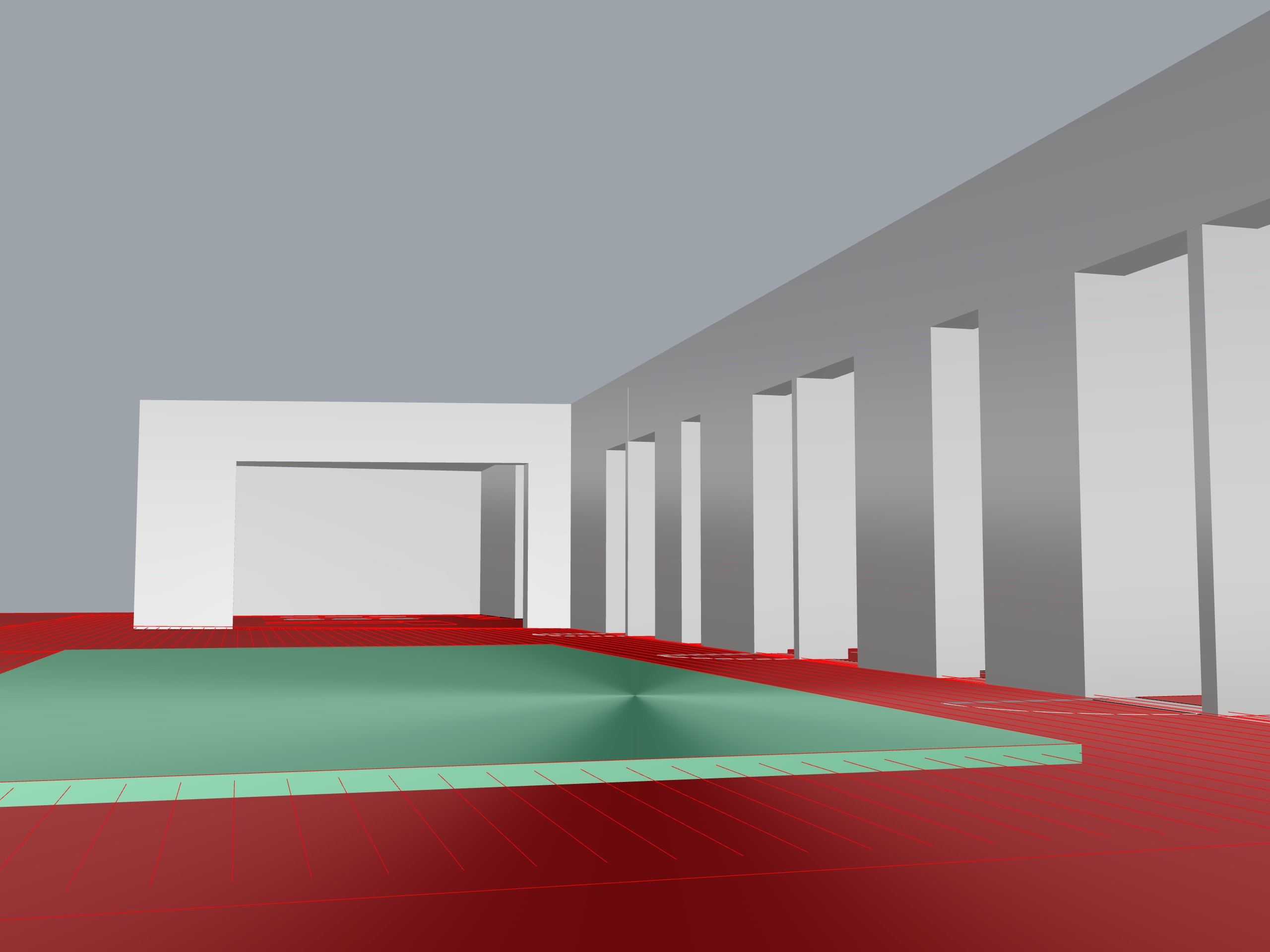 render a modern architectural scene with an open corridor featuring large rectangular pillars on the right all in crisp white the corridor floor and surrounding ground are vivid red creating a striking contrast in the center a rectangular pool with soothing teal water adds tranquility the sky is a soft overcast gray lending a calm and serene atmosphere the overall scene should feel minimalist and peaceful with careful attention to clean lines and bold color contrasts