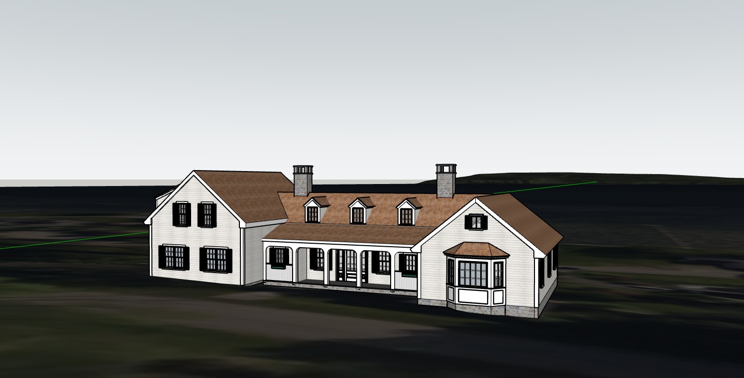 a charming countryside house with a colonial design featuring white wooden siding and a warm earthy brown shingle roof the windows are accented with dark forest green shutters and the porch is adorned with classic white columns the chimneys are built with rustic gray stone surround the house with lush green grass and add vibrant wildflowers in shades of lavender and gold the atmosphere is serene and idyllic set under a clear azure sky with a soft golden glow from the late afternoon sun casting gentle shadows