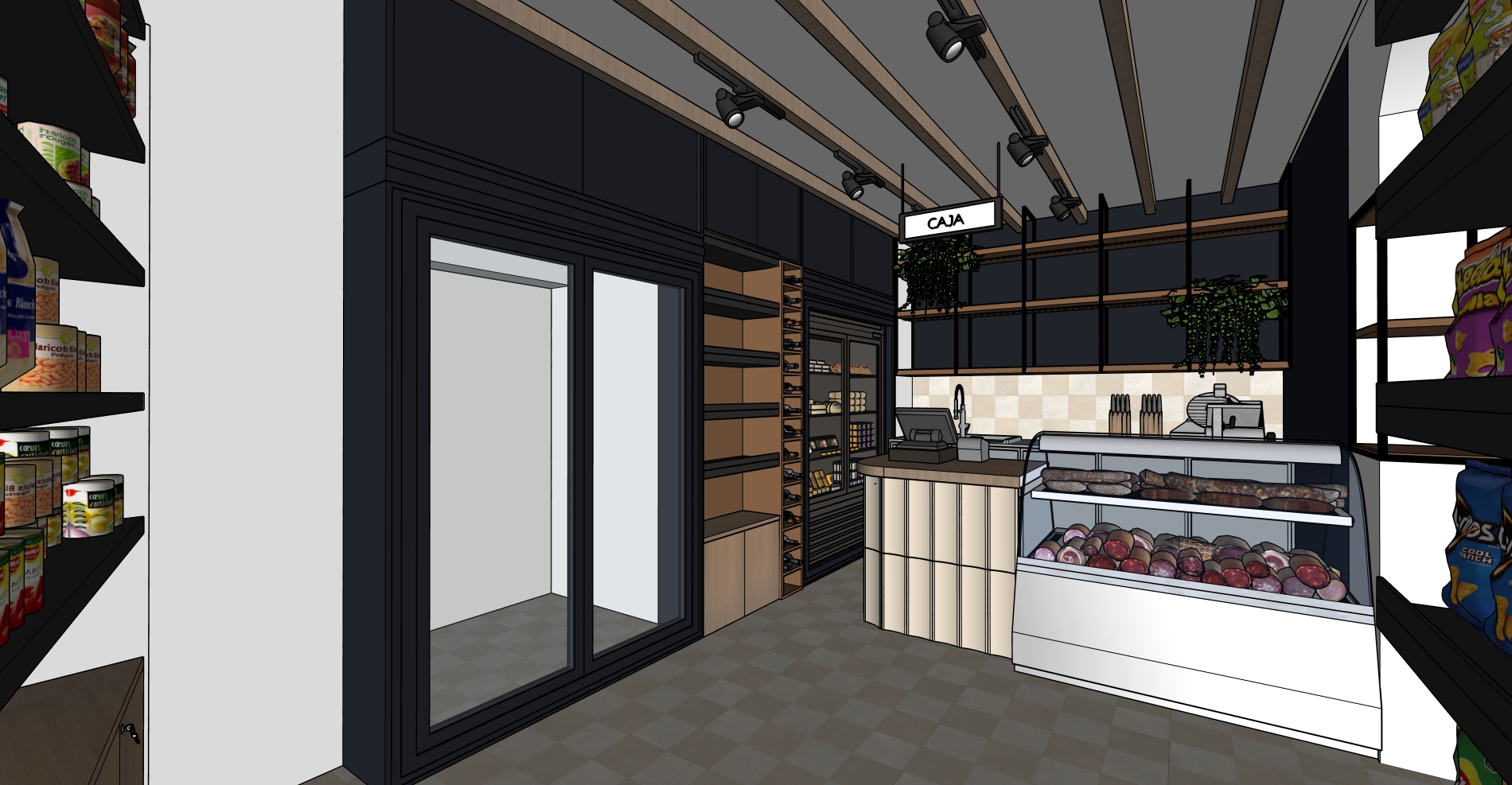 crea una imagen fotorealista a partir de esta de sketchup la unica luz natural que entra es de la puerta de la izquierda el resto de la tienda son paredes sin ventanas