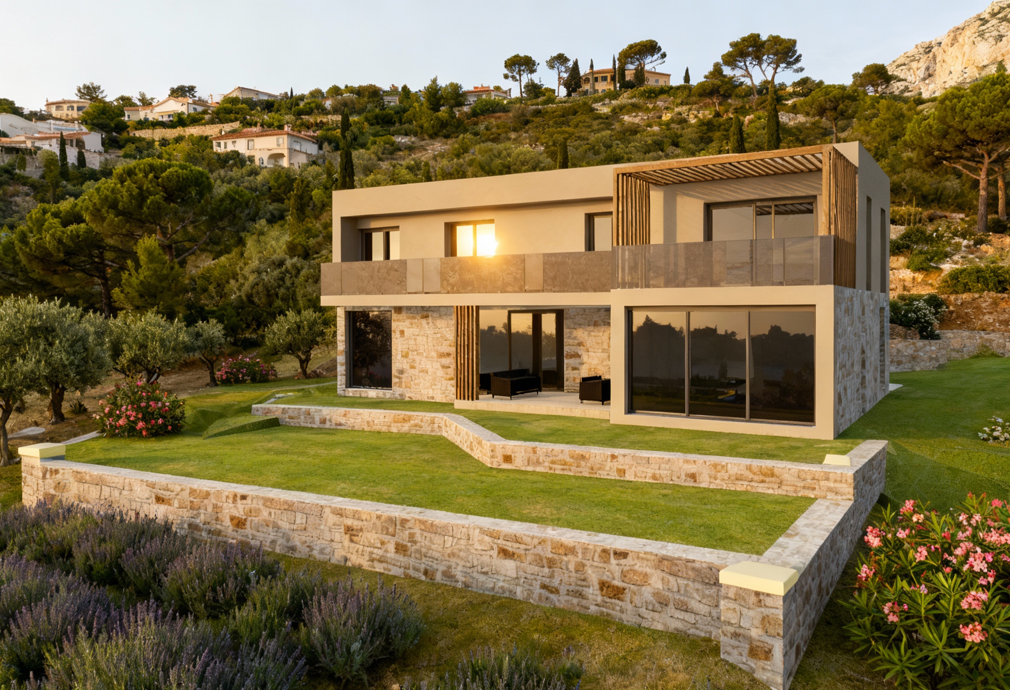 do not change any details on the home create a visual that i am looking through a wheat field up at the home at an angle