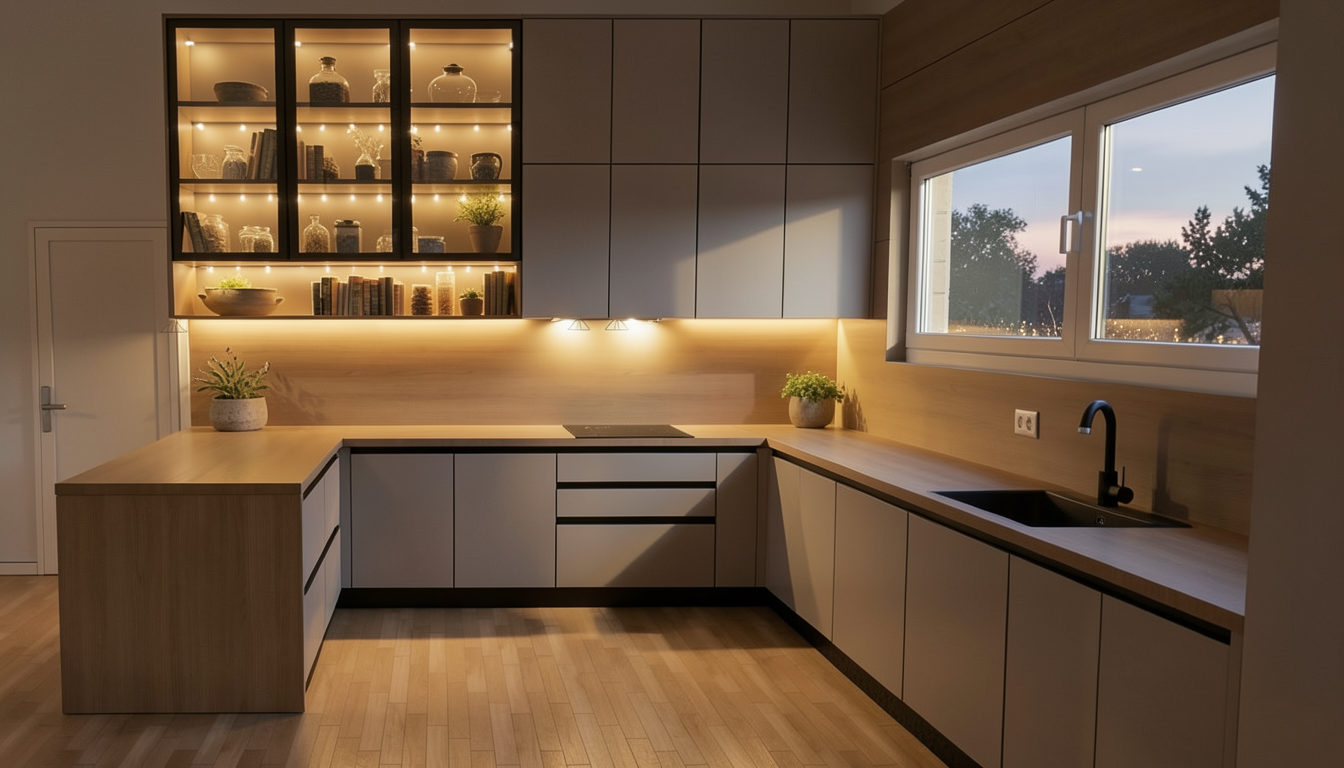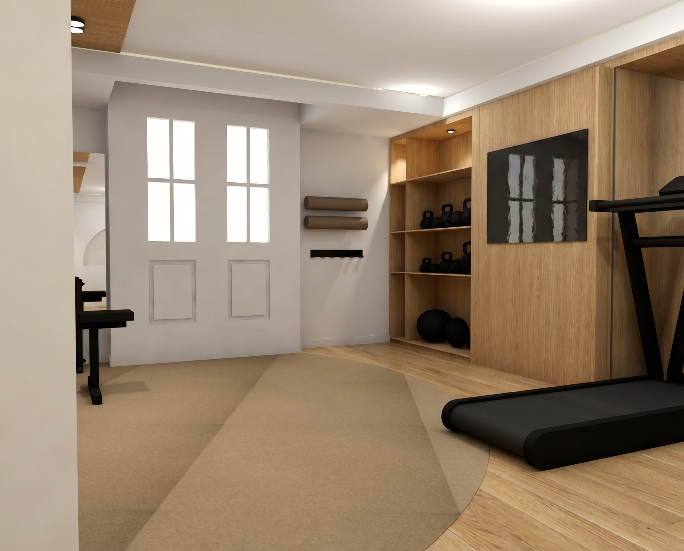a calm elegant contemporary outdoor courtyard with a minimalist architectural language the scene features a tall central decorative screen made of vertical beige slats creating a refined semi transparent partition and adding rhythm depth and visual lightness to the composition the surrounding walls are smooth warm white plaster keeping the palette soft and understated lighting should be soft and natural like late afternoon daylight with gentle shadows and a calm luxurious mood the final render should look refined realistic and architectural with strong material clarity and a high end design feel light beige color at the walls remove the black rectangular back in the plants