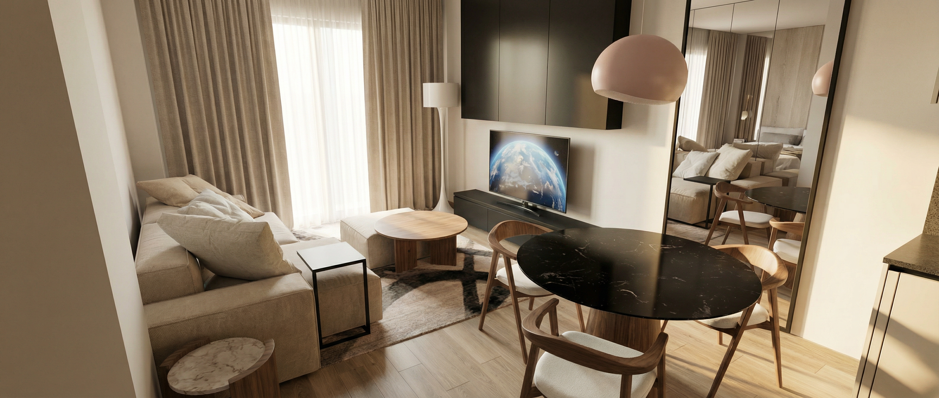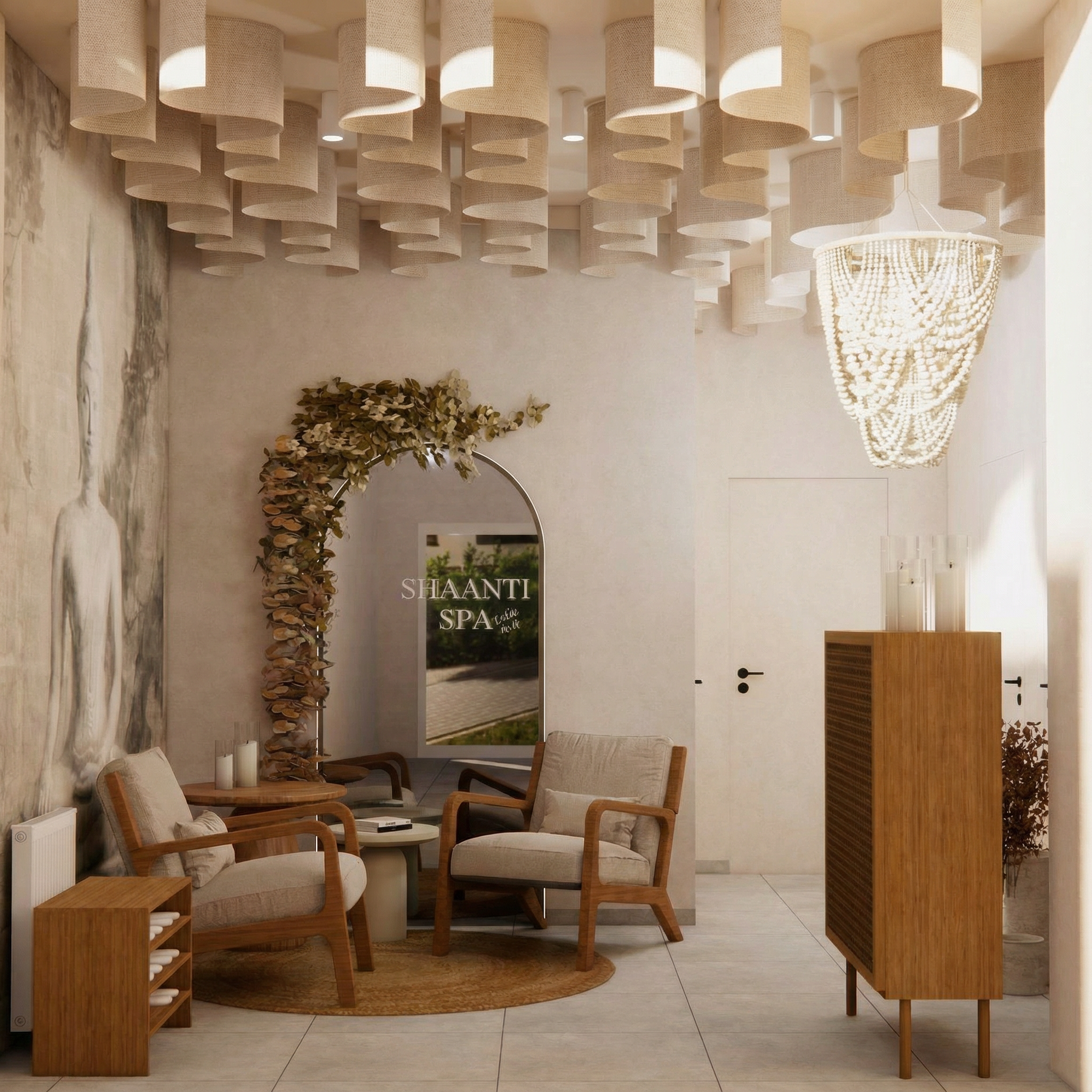 photorealistic spa beauty clinic reception interior warm minimalist design natural beige and sand color palette calm luxury atmosphere soft natural daylight entering from the right side through large glazing realistic light diffusion gentle shadows balanced exposure organic suspended fabric ceiling panels with inverted wave direction softly draped and naturally folded textile irregular organic waves visible fabric weave realistic gravity behavior subtle shadows between folds white ceiling ceramic tile floor with subtle grout lines and surface roughness woven natural fiber round rug with realistic texture minimal seating area with wooden lounge chair and fabric upholstery soft creases realistic fabric tension decorative dried plants and greenery with organic irregularity natural variation in color and density handcrafted pendant lamp with beaded texture soft warm glow realistic light falloff floating shelves with skincare products in ceramic and glass packaging slight label imperfections and reflections add two female clients sitting on the lounge chairs adult women with natural appearance wearing elegant casual spa appropriate clothing in soft neutral tones and slippers they are seated comfortably relaxed posture waiting calmly no posing no direct eye contact with the camera natural body proportions realistic skin texture understated presence that does not overpower the interior ultra realistic materials pbr textures global illumination soft ambient occlusion realistic scale and proportions shot on full frame dslr 35mm lens eye level camera professional interior photography style shallow depth of field clean but lived in space no cgi look no over sharpening