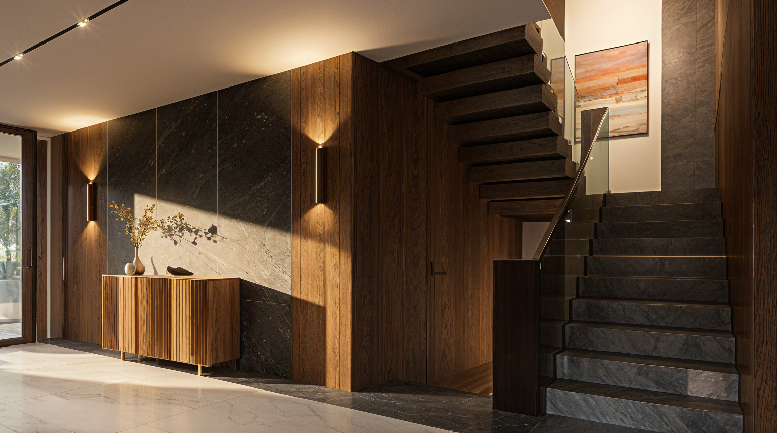 ensure all timber finishes remain the same color set the timber tone to a consistent light grey warm color across all timber elements do not change the timber texture grain or material color consistency only do not change the design layout camera angle or material proposal maintain all original materials textures and finishes exactly as provided enhance realism through accurate lighting shadows and material rendering only produce a clean professional photorealistic architectural render