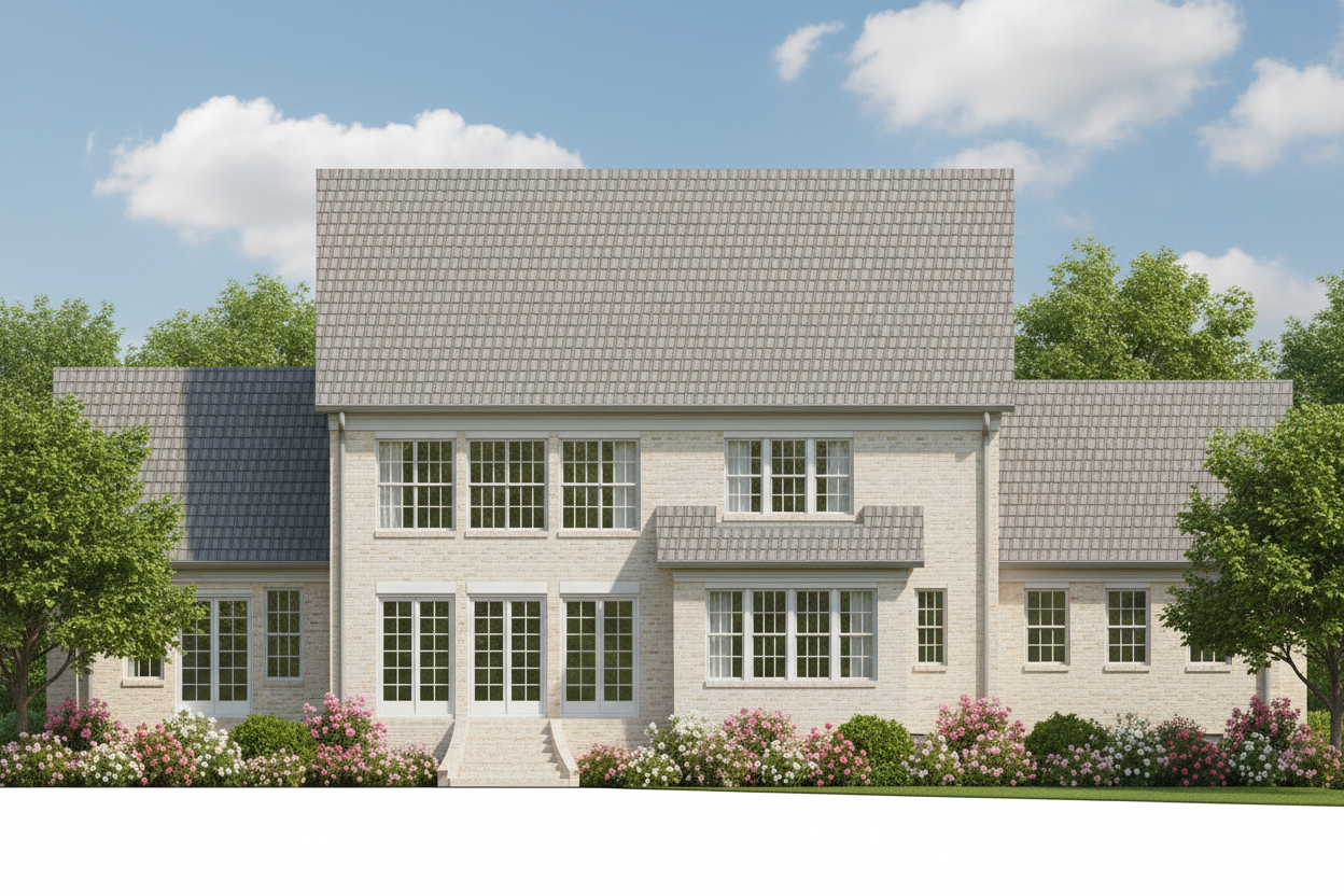 rear elevation of a charming traditional house with a warm and inviting atmosphere the house has a classic gabled roof with shake shingles in a soft gunmetal color the exterior walls are clad in cream painted brick giving it a timeless look the window and door frames are painted in crisp white adding a fresh contrast large windows allow plenty of natural light to flow into the house the roof is complemented by a sky blue background with fluffy white clouds creating a serene sky the surrounding landscape is lush with greenery featuring vibrant green trees and colorful flower beds filled with roses in shades of pink and white enhancing the welcoming feel add an in ground pool centered on the house
