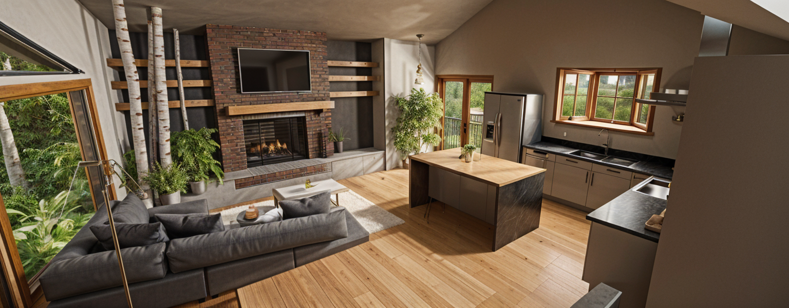 modern perspective shot add a photorealistic alaskan backyard full of trees and shrubs architecture