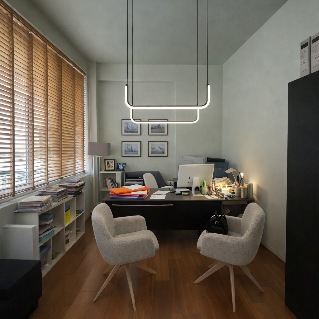 create a modern office interior with a serene and productive atmosphere feature a sleek black desk with a cluttered yet organized appearance showcasing orange and red folders scattered across include a cozy gray fabric chair with light wooden legs on either side of the desk highlight the warm ambience created by a contemporary led pendant lamp emitting a soft white glow add large beige blinds on the left window filtering natural daylight the floor should be a rich warm brown wood incorporate a set of framed artworks on a light gray wall adding sophistication and depth to the scene ensure the overall color palette remains neutral with accents of light wood and black for a harmonious and stylish design