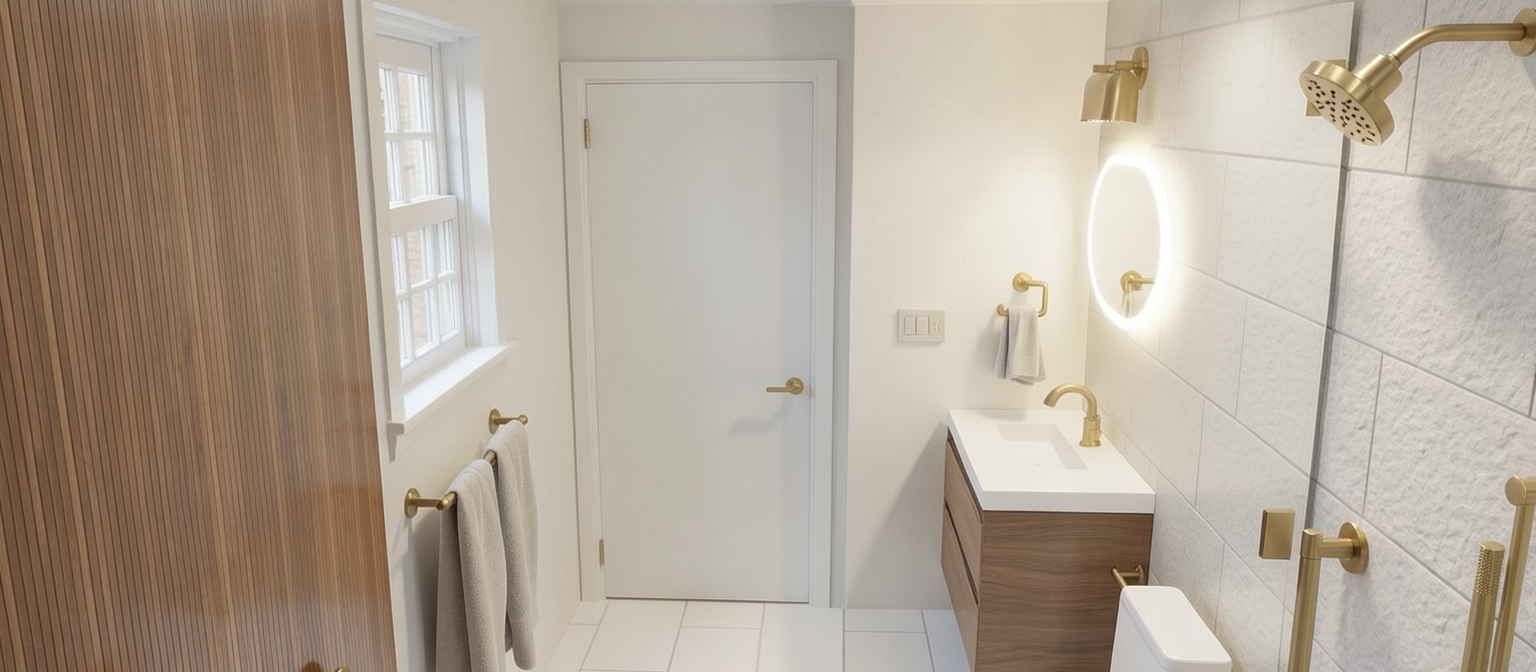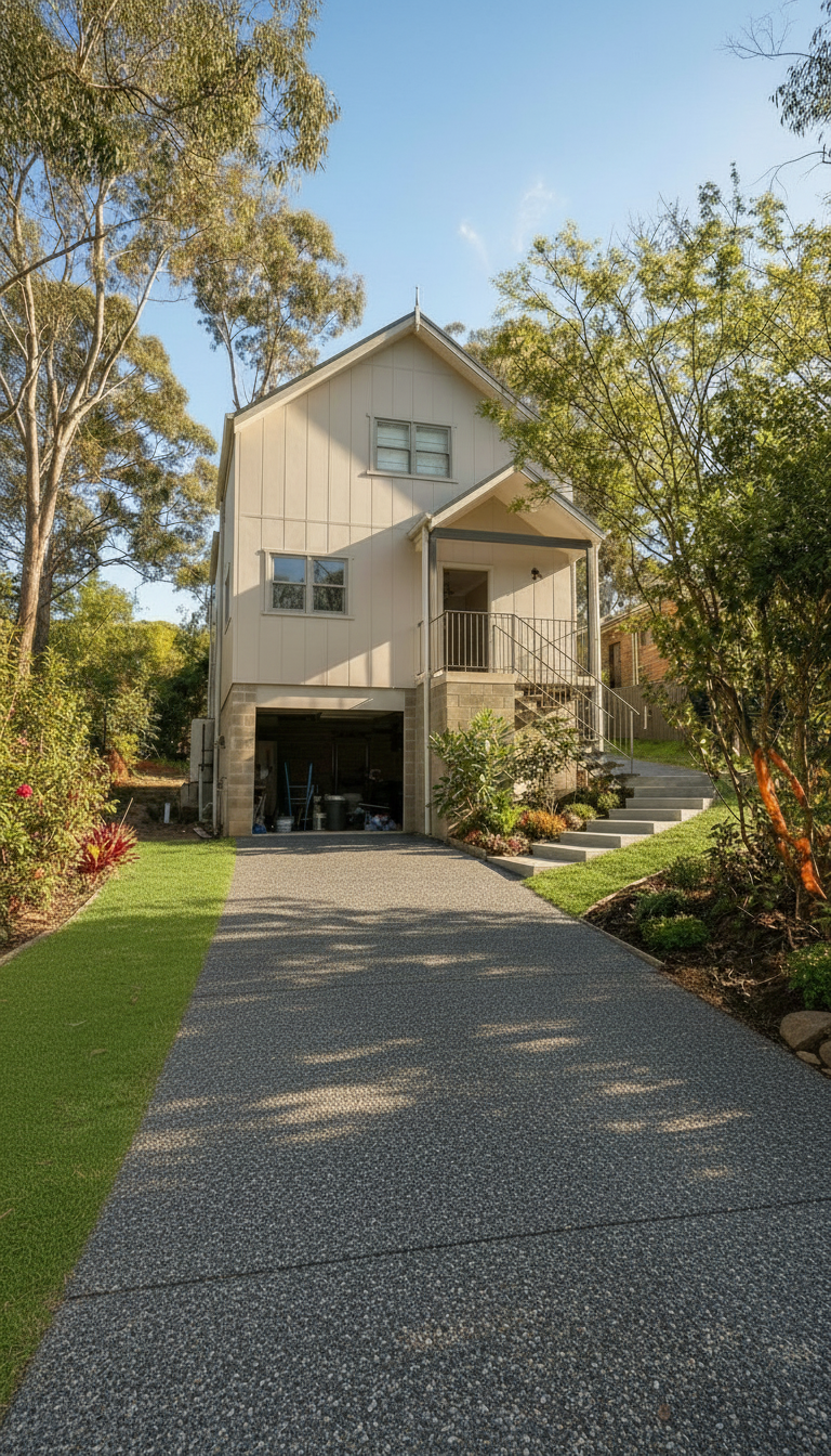 add a white garage door and a white main entry door at the top of the stairs