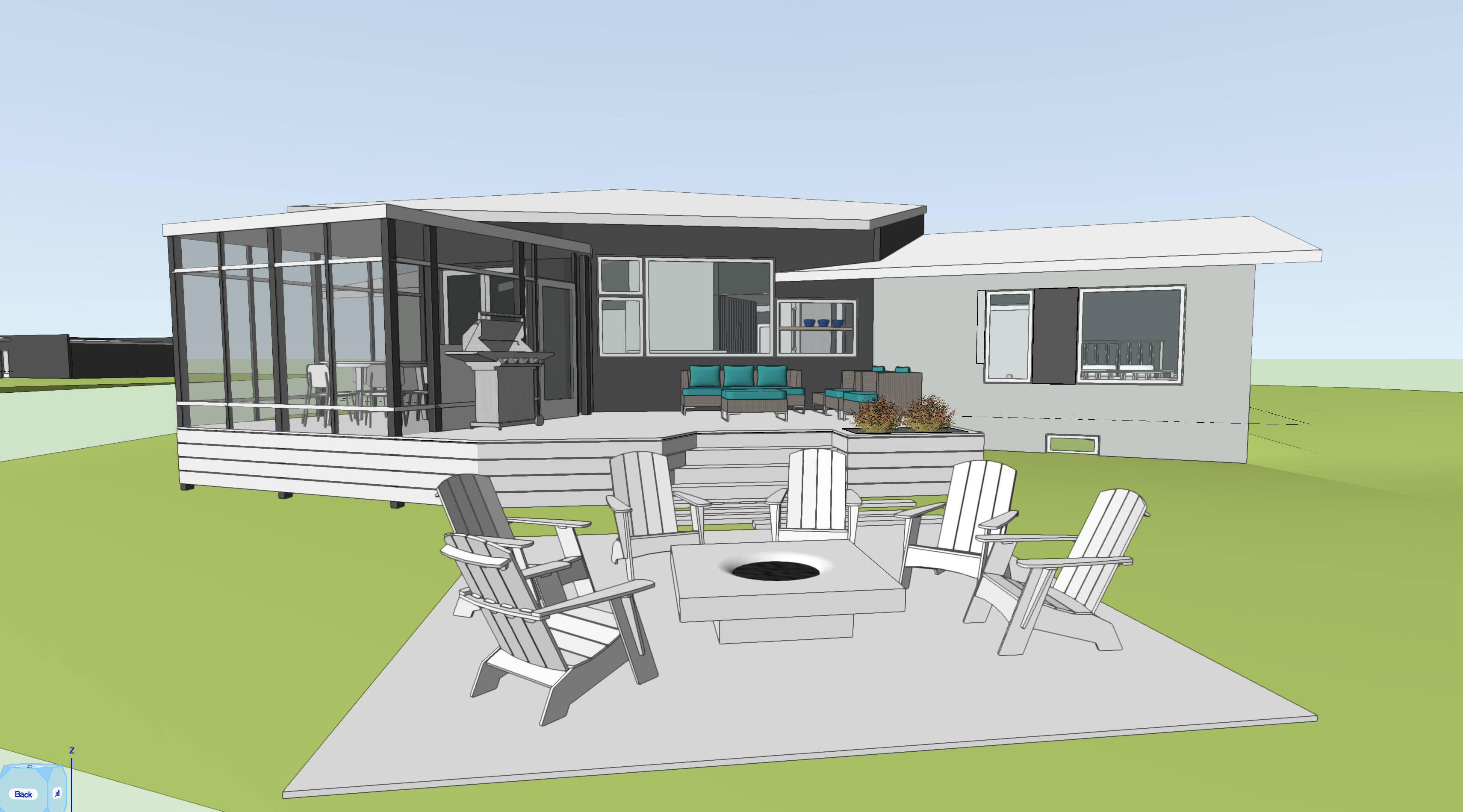 black asphalt shingles at roof vertical warm wood siding on light grey exterior walls vertical grey wood siding on dark exterior walls wood posts at screened porch sun is coming from behind house this is the north facing backyard afternoon sun wood deck with stone patio add plants in front of deck add a fire to the fire pit add a little white and brown fluffy dog black windows