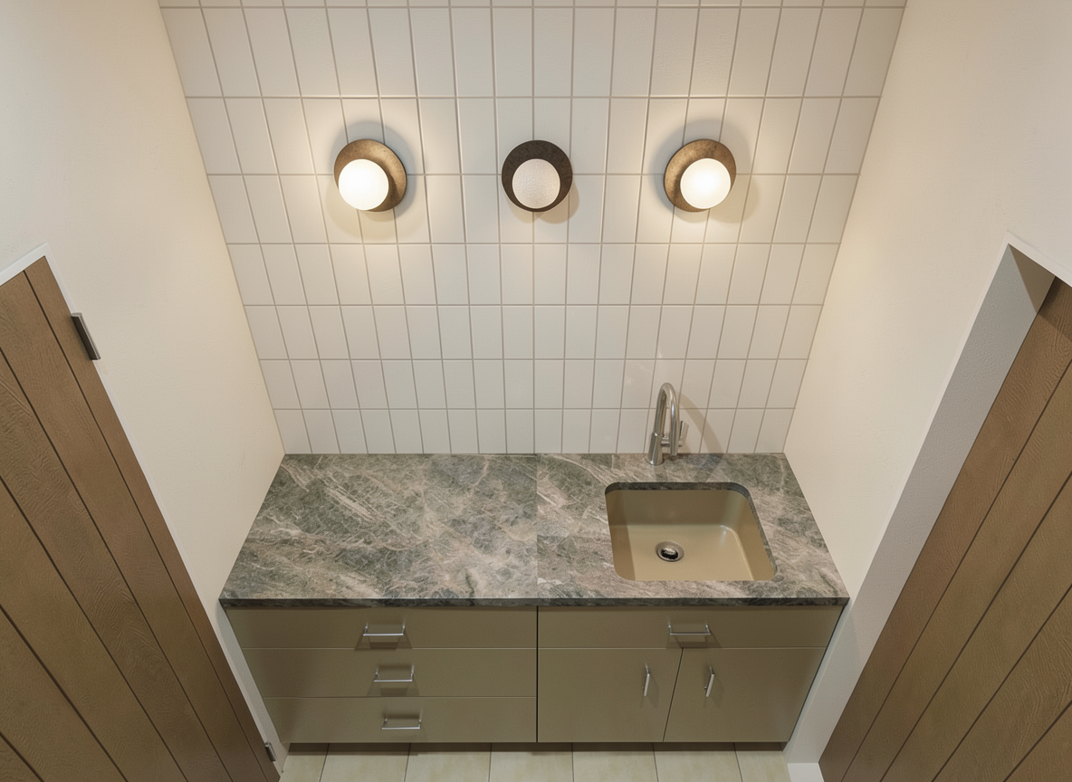 render two modern dwellings made from beige coloured natural stone and light coloured timber with green roofs set in the countryside with trees and foliage surrounding them