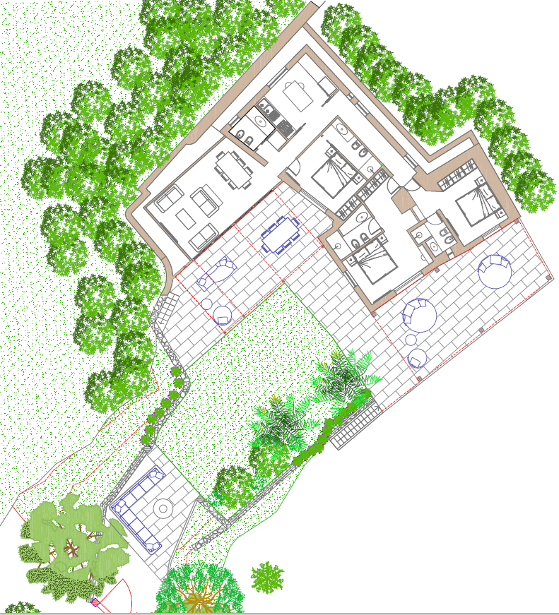 convert this floor plan into a realistic isometric 3d view of a full house show the space from an elevated angle with furniture walls and details visible usa colori molto tenui parquet in rovere a listoni opaco per l interno bagni e cucina in travertino non usare stoffe colorate usa il travertino per la pavimentazione esterna e arredi con colori tenui mantieni l arredo esattamente dove si trova e rispetta la distribuzione use the same furniture as shows on the plan do not change the orientation of the floorplan