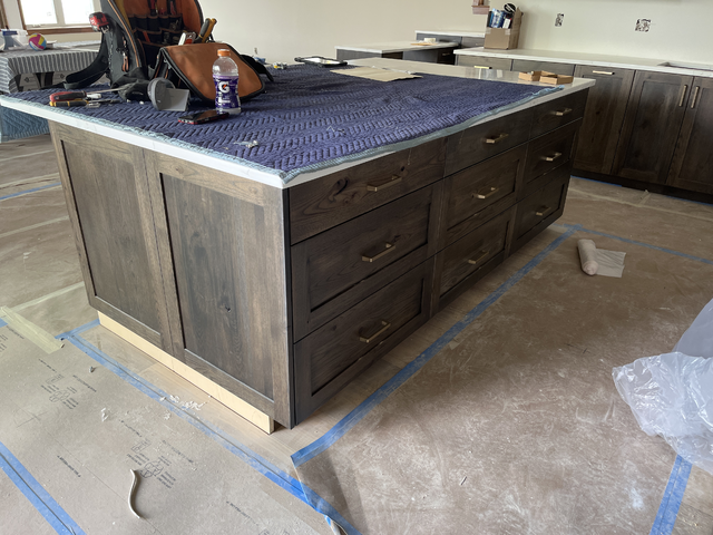 do not change the cabinets in any way preserve the exact cabinet colors materials finishes dimensions door and drawer styles hardware spacing alignment and all geometry exactly as shown do not alter the countertop shape backsplash appliances flooring lighting fixtures or wall structure only remove the construction materials clutter and mess from the scene clean the room and make it look finished and staged add a few simple tasteful home accessories appropriate for the style of the space but do not add or remove any furniture windows or architectural elements maintain the original lighting direction and realism enhance clarity and polish the photo while keeping the cabinetry and room design completely unchanged do not alter the lighting to keep the cabinet colors as they are in the image add new flooring stage the countertop for coffee breakfast