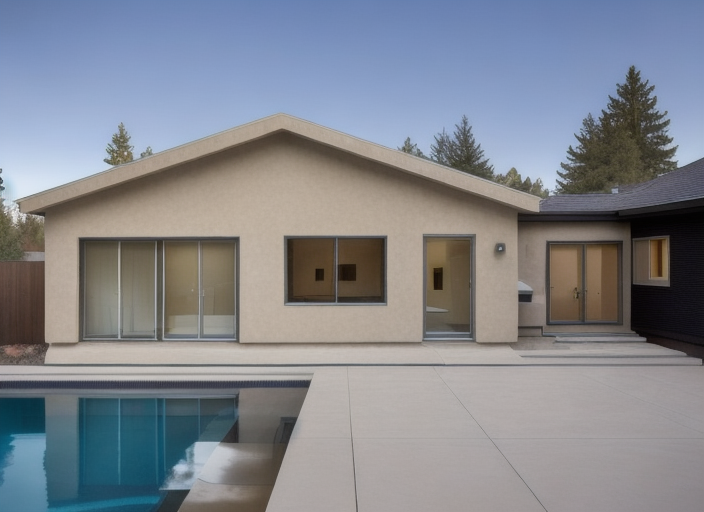 modernist exterior shot beige stucco exterior with a dark roofing with a babercue area on the side there s a tree on side and fireplace on the foreground architecture