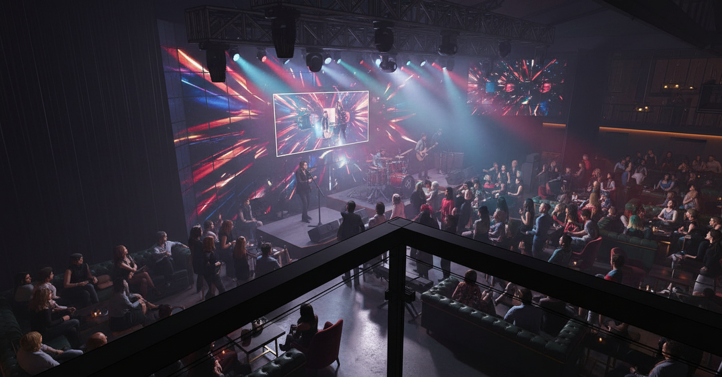 zaha hadid perspective shot keep the exact point of view camera angle camera height and distance to the stage exactly as shown in the supplied image this point of view is close to the stage from the balcony edge looking down toward the performers and led wall do not move the camera do not shift closer or farther and do not change the focal length preserve the current proximity to the stage and the downward viewing angle convert this scene into a photoreal upscale nightclub in use at night preserve the architecture and proportions exposed steel truss system balcony railing stage risers wood stage fascia rigging locations and the single led wall do not alter the structural layout add dramatic stage lighting with visible beams and subtle atmospheric haze like a premium concert beams must originate from the existing fixtures on the truss and read clearly from this close balcony perspective haze should define the beams without obscuring performers dim the single led wall slightly so it does not overpower the room show one unified abstract motion background across the entire led surface no collage no text no logos no photographs no recognizable shapes integrate a simulated picture in picture imag window within the led wall content as a rectangular routed layer from a switcher the led wall is the only display surface no tvs no secondary screens no monitors populate the venue with upscale lounge seating on the floor and balcony furniture must be premium tufted leather and velvet sofas dark wood tables brushed metal accents increase patron density the room should feel active and attended all patrons must face the stage and pay attention to the performers engaged and focused not distracted not using phones use polished concrete flooring with soft reflections maintain warm architectural lighting across the room with accent illumination on structural lines and on the spiral ceiling feature if visible overall mood is modern exclusive energetic and concert driven architecture