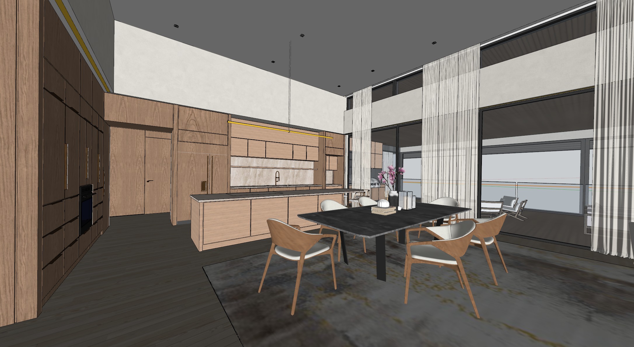 make kitchen look realistic dont change architecture behind the window make wood floor more taupe color dont edit floor rug under dining table