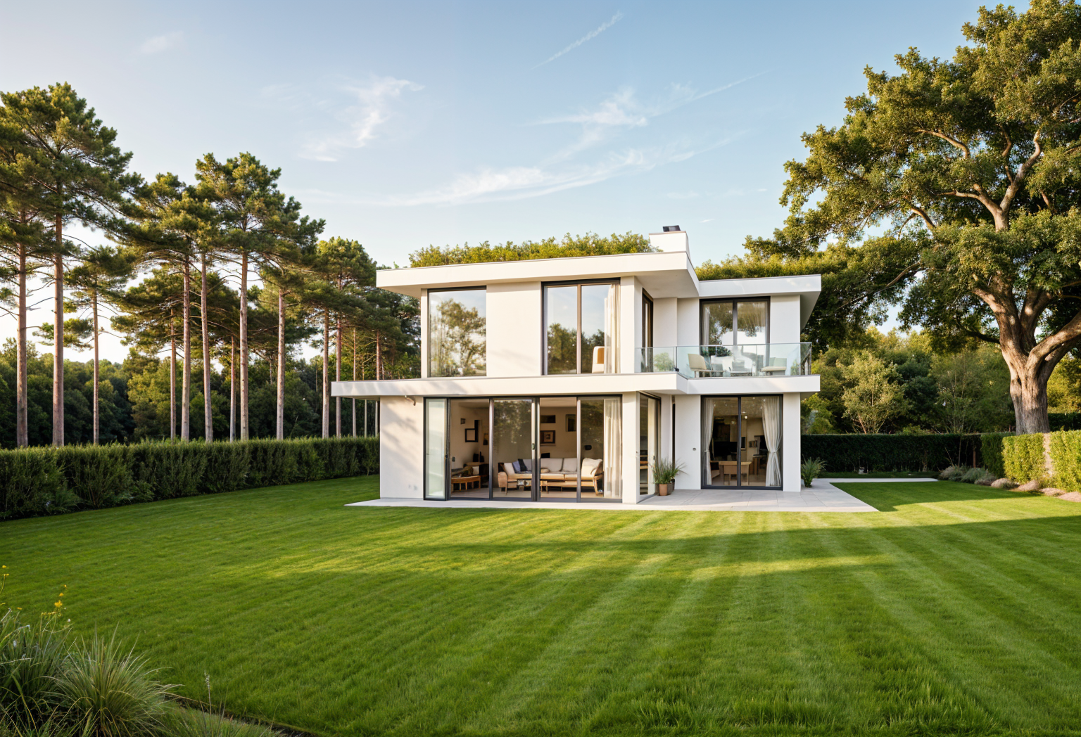 a manicured lawn layered flower beds low maintenance shrubs native plants stone pathway leading to the entrance in a modern style