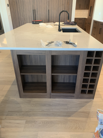 do not change the cabinets in any way preserve the exact cabinet colors materials finishes dimensions door and drawer styles hardware spacing alignment and all geometry exactly as shown do not alter the countertop shape backsplash appliances flooring lighting fixtures or wall structure only remove the construction materials clutter and mess from the scene clean the room and make it look finished and staged add a few simple tasteful home accessories appropriate for the style of the space but do not add or remove any furniture windows or architectural elements maintain the original lighting direction and realism enhance clarity and polish the photo while keeping the cabinetry and room design completely unchanged do not alter the lighting to keep the cabinet colors as they are in the image add a simple view out the window add flooring stage the countertop for a minimalistic kitchen add wine bottles to the small cubbies add stools to the island