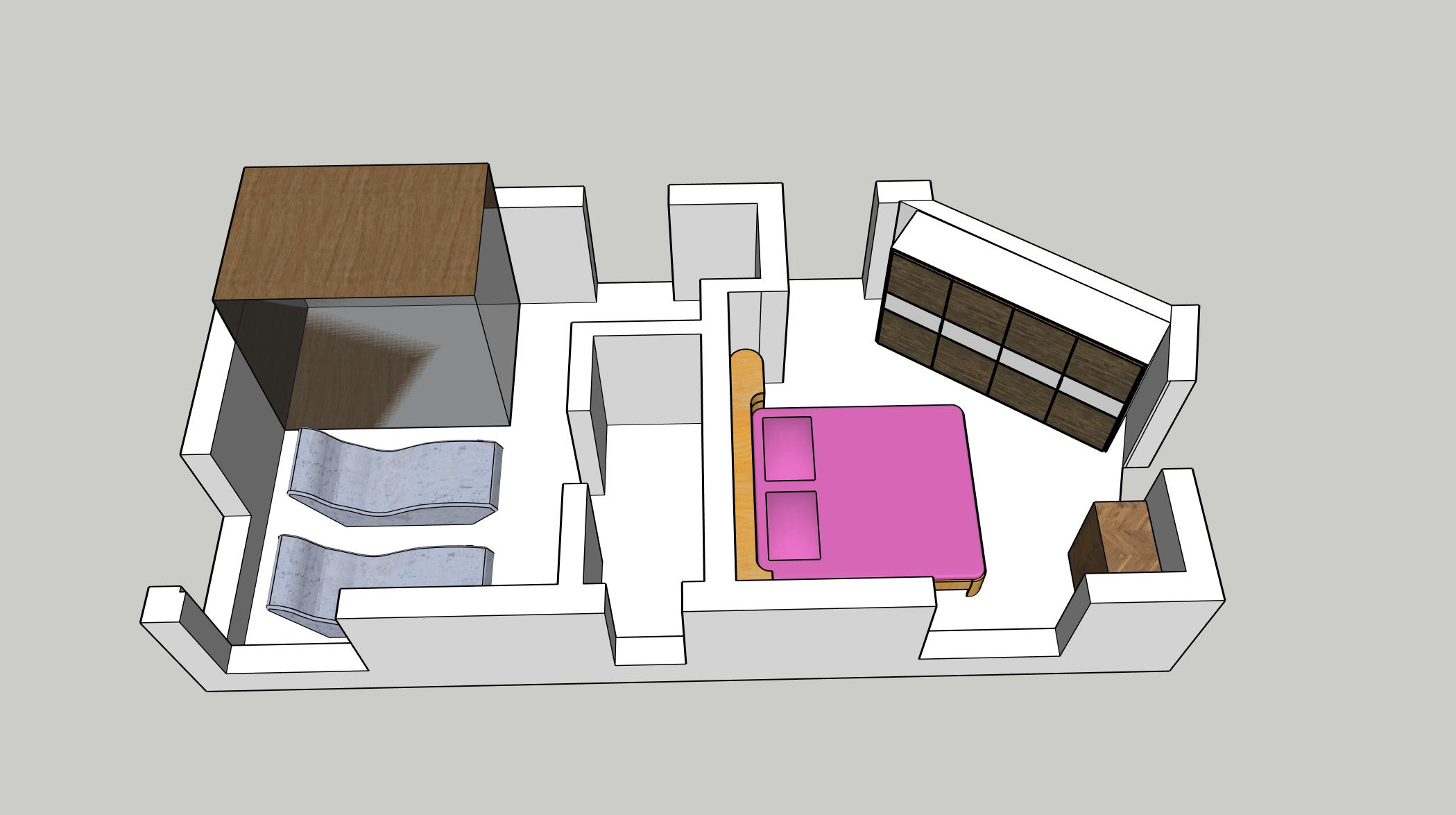 left room private home spa wellness room finnish sauna cabin with full glass wall facing the room two heated tepidarium stone loungers in light gray warm indirect led lighting materials light oak wood sauna interior large format stone tiles on floor 60x60 warm gray white plastered walls ambient calm spa atmosphere towel hooks near entry small side table between loungers natural daylight from two windows right room modern bedroom king size bed with upholstered headboard neutral warm tones two nightstands in light oak built in wardrobe along angled wall handleless light oak fronts small dresser next to balcony doors wooden floor warm oak tone soft textile accents linen bedding in off white cream balcony doors with sheer curtains cozy minimal warm atmosphere