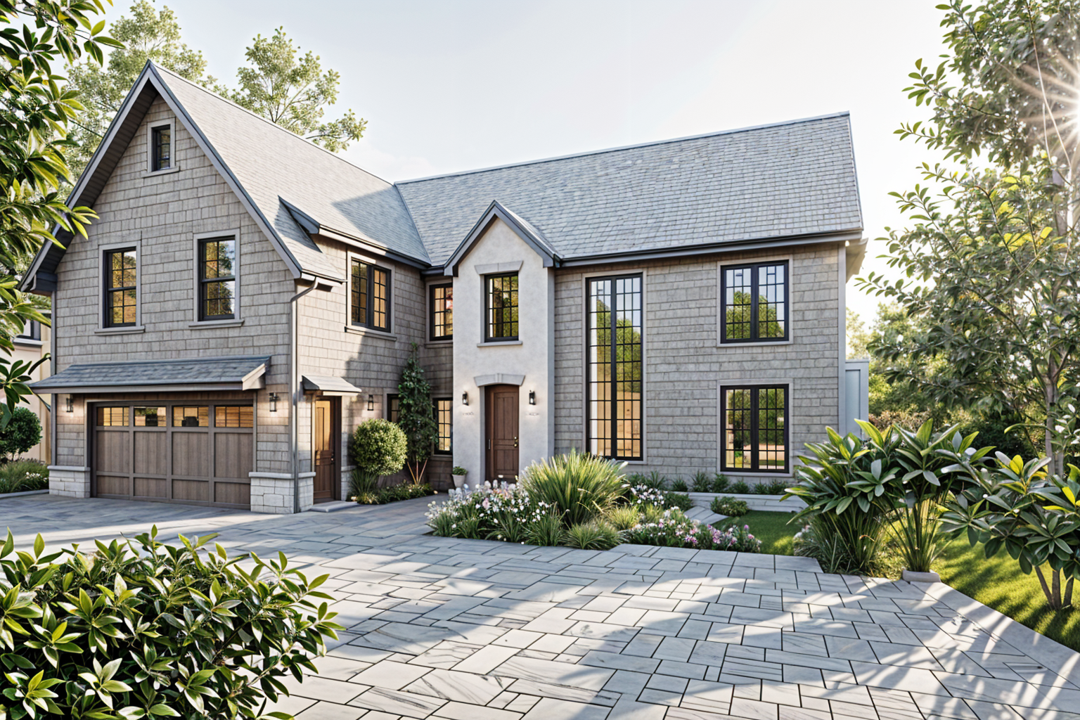 remove small window in gable face increase contrast in stone column and show as more realistic grey stone english cottage style leave all other materials the same
