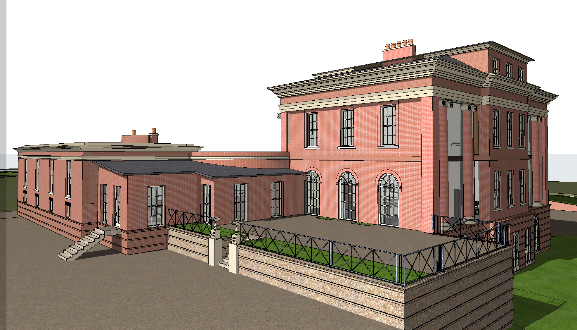 render a classic architectural building with red brick walls and cream accents the roof is a slate gray complementing the wrought iron railings in black the building stands on a flint terrace its texture realistic in warm earthy tones large arched white window frames reflect a bright sky casting soft daylight shadows surround the scene with meticulously maintained greenery vibrant green grass contrasting against the red warm brick the atmosphere is serene and elegant capturing the grandeur of the architecture with a clear bright sky overhead