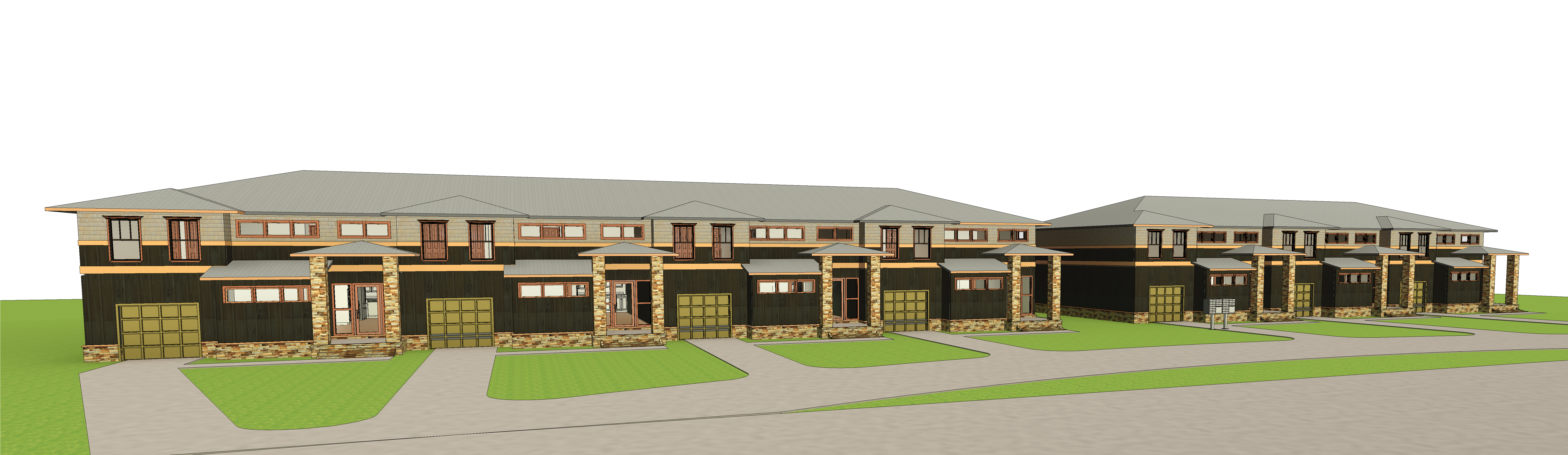 high tech detail shot residential townhomes with stone veneer with standing seam metal roofing architecture