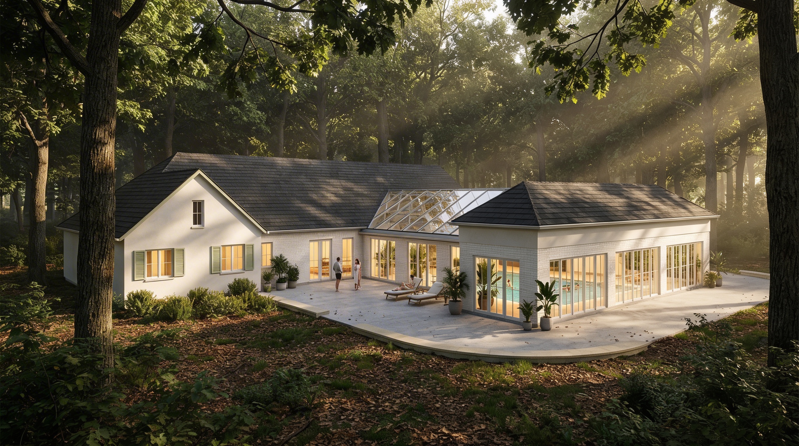 a serene countryside pool house surrounded by lush green trees with sunlight streaming through the leaves casting soft golden rays the house is painted in a warm cream color complemented by soft olive shutters the roof has a gentle grayish blue tone the atmosphere is peaceful and inviting with elegantly dressed people engaging in leisurely conversations the patio features muted earth toned tiles and subtle lavender and sage colored plants enriching the tranquil ambiance children playing on grass smaller patio