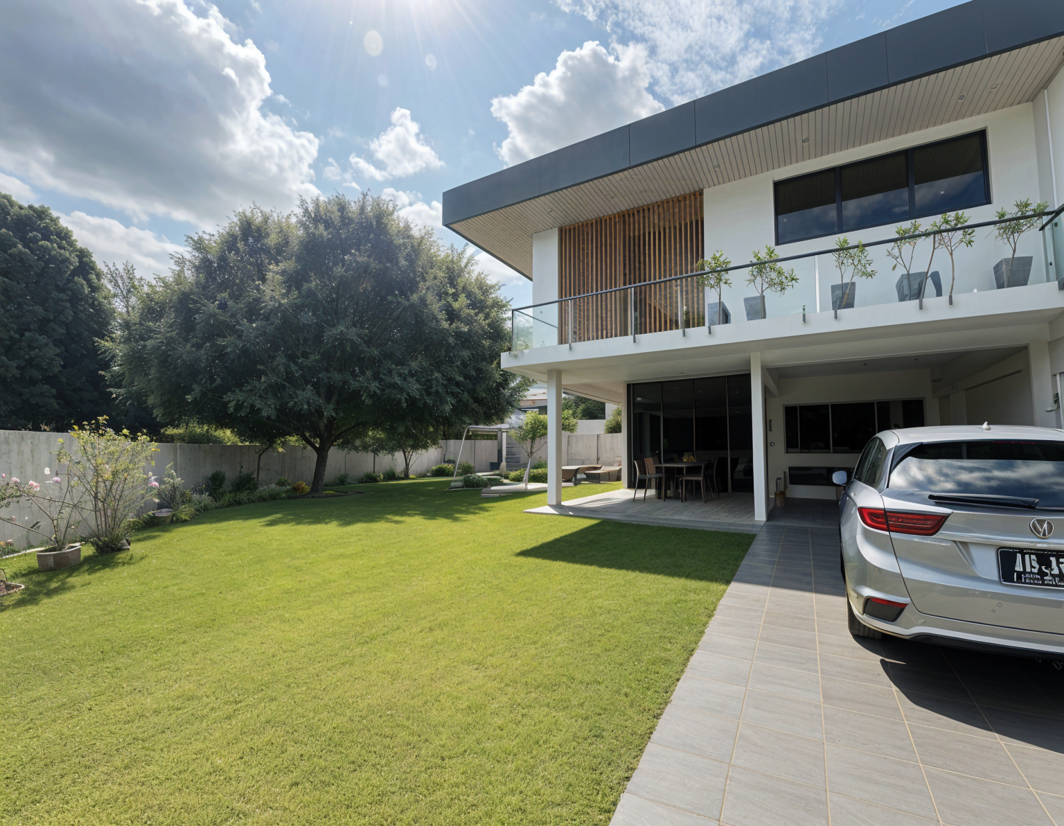 a serene bedroom seamlessly transitions into a lush tropical paradise the room features a plush cozy bed with soft white linens and a light brown textured throw blanket rich warm wood tones encompass the bed frame and floor creating an inviting earthy atmosphere large glass doors open up to a sunlit deck where natural light dances across the wooden floorboards casting gentle shadows a gentle breeze flows through the sheer cream colored curtains adding to the peaceful sunlit ambiance