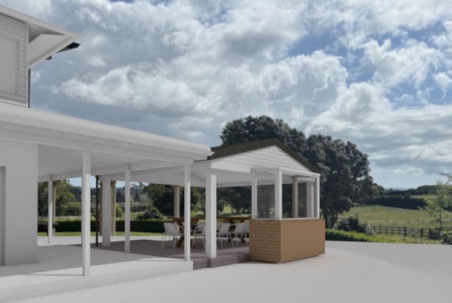 gardens around the outdoor canopy keep original building white show brick veneer on bbq units show gardens in front of brick
