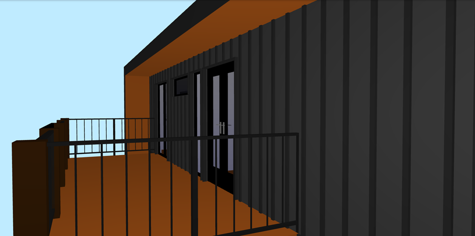 this the outdoor deck area on the second floor of a small modern home the exterior of the home is in black board and batten vertical siding and the deck boards are a dark colored walnut beyond the deck should be spruce and pine trees with golden hour lighting