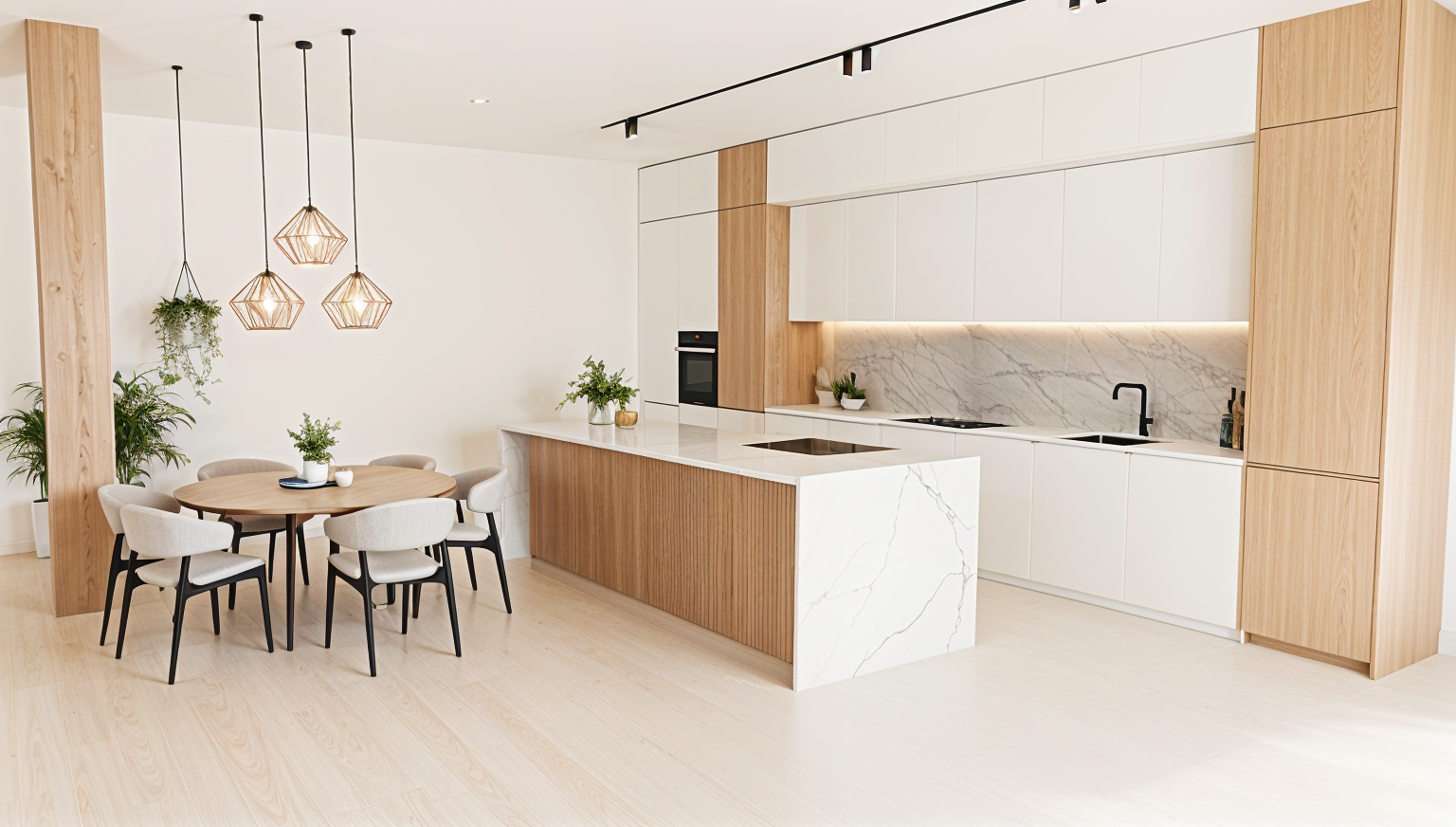 a modern conference room with a minimalistic design featuring white walls glossy white tables and sleek blue chairs two business people in professional attire one in a crisp red shirt in a discussion a presentation on the wall with graphs in shades of blue and orange the atmosphere is bright focused and professional with soft lighting creating an inviting and productive environment