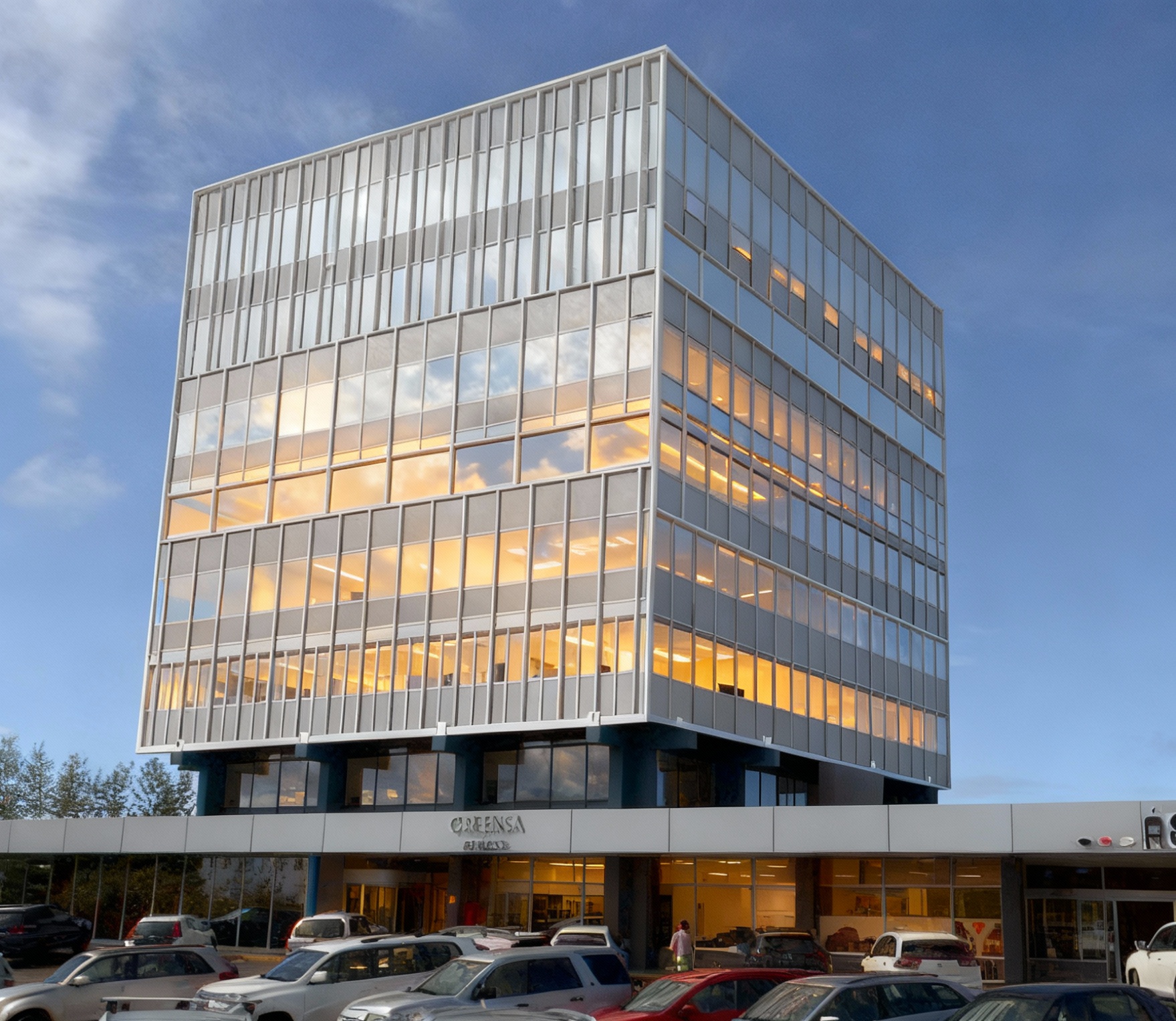 the image should show the building at dusk with light glowing out of the office floors give the gray panel a more milky reflective hue overall the building should have more light coming out of the top floors with people and office landscape visible inside also make the deeper mullions in the window system twice as deep