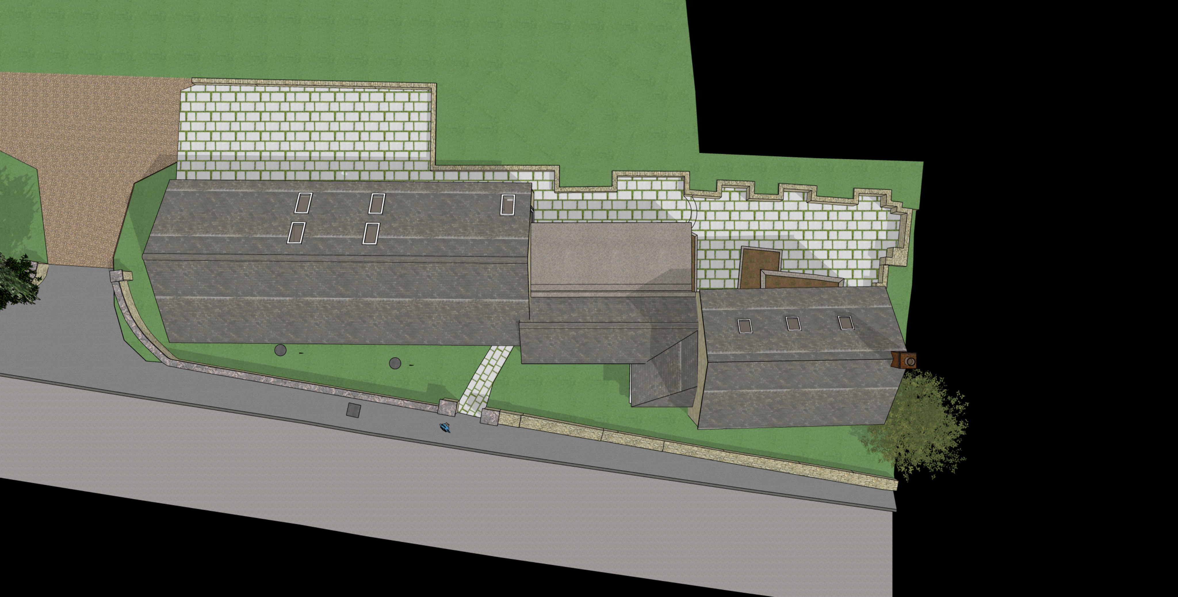render a photorealistic 3d birdseye view of this house in oxfordshire uk reference the current material style keep model geometry the same windows doors roof walls garage door pavement driveway do not change the view or colour scheme only enhance the current materials such as stone and clay roof tiles and make the landscape native to the uk with light atmospheric depth render in hyper realistic architectural visualization quality 8k resolution