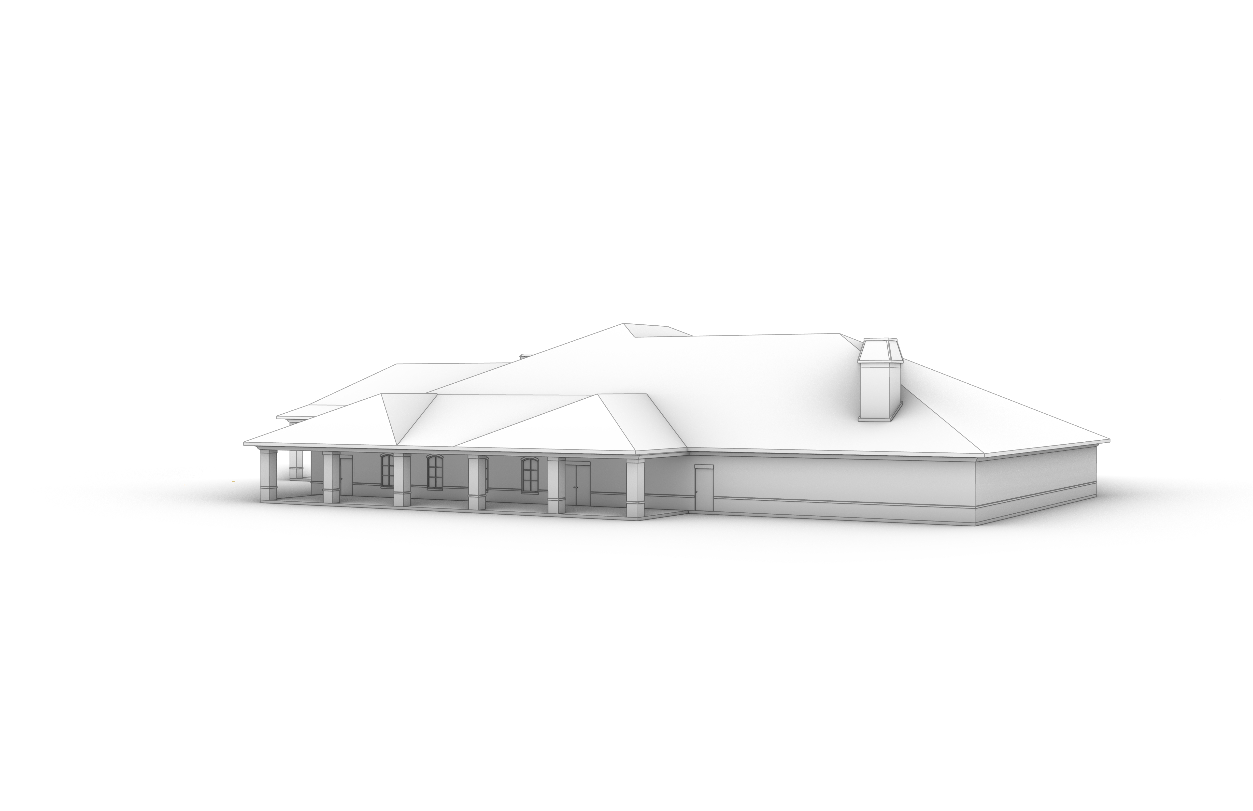 this is a funeral home in greenville sc make a realistic render the walls should be reddish brown brick the roof should be black shingles the columns should also be brick the trim should be painted white the front of the building should have landscaping found in south carolina there should be minimal paving for parking with access to the front carport make shutters a light grey