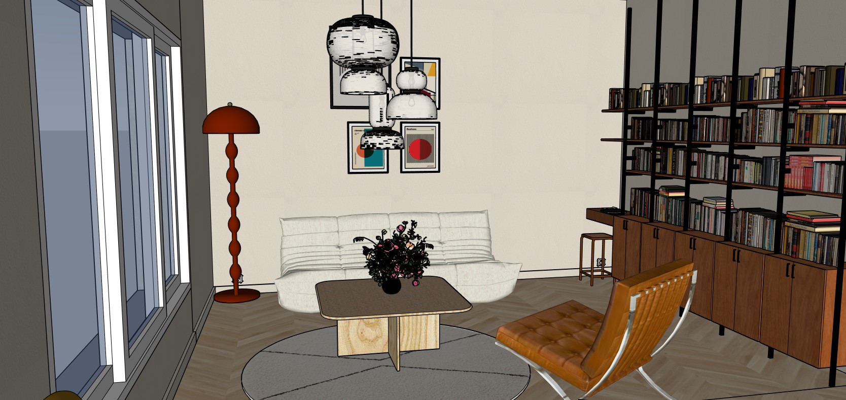 photo realistic living room respect proportion natural light from the window and sof and warm light from the lamps above the coffee table