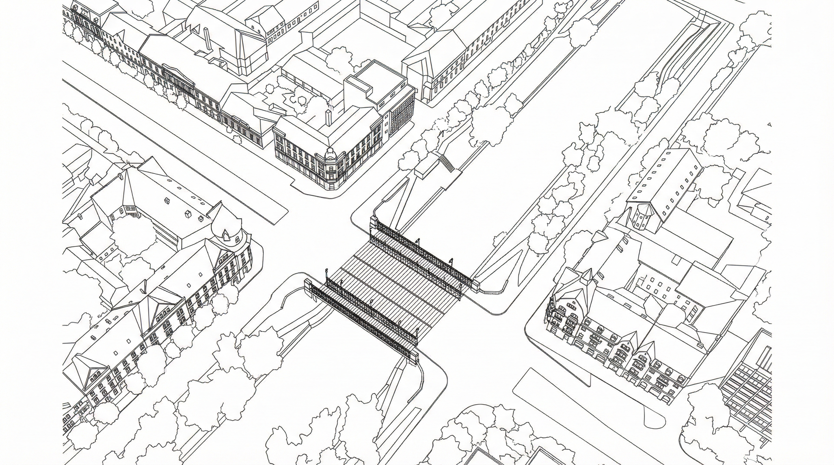 remove text from the top of picture put people on the ground flat river under the bridge light ochre beige facade 1910 s atmosphere people dressed in 1910 s style dressings dark window and door frames untreated banks undeveloped banks in picturesque undeveloped shapes 2 horses pulling a tram car from 1900