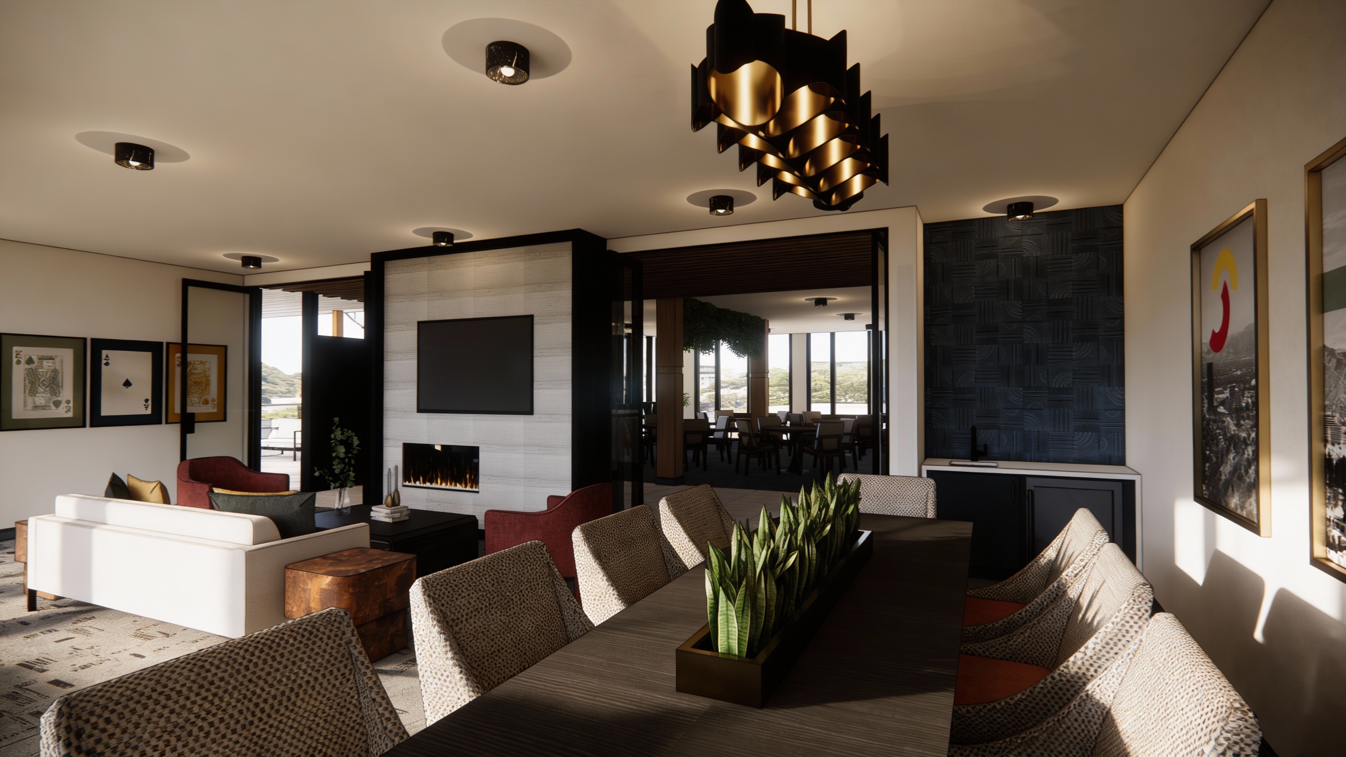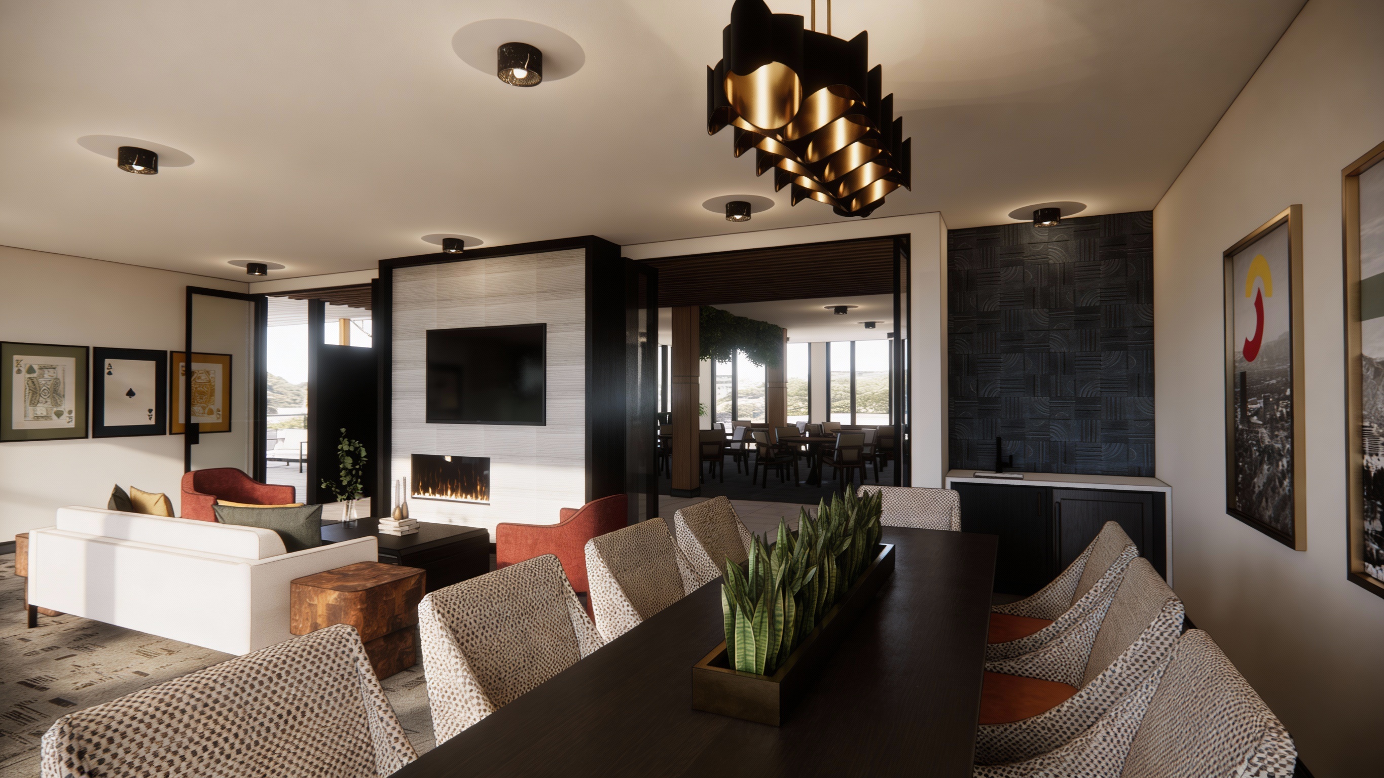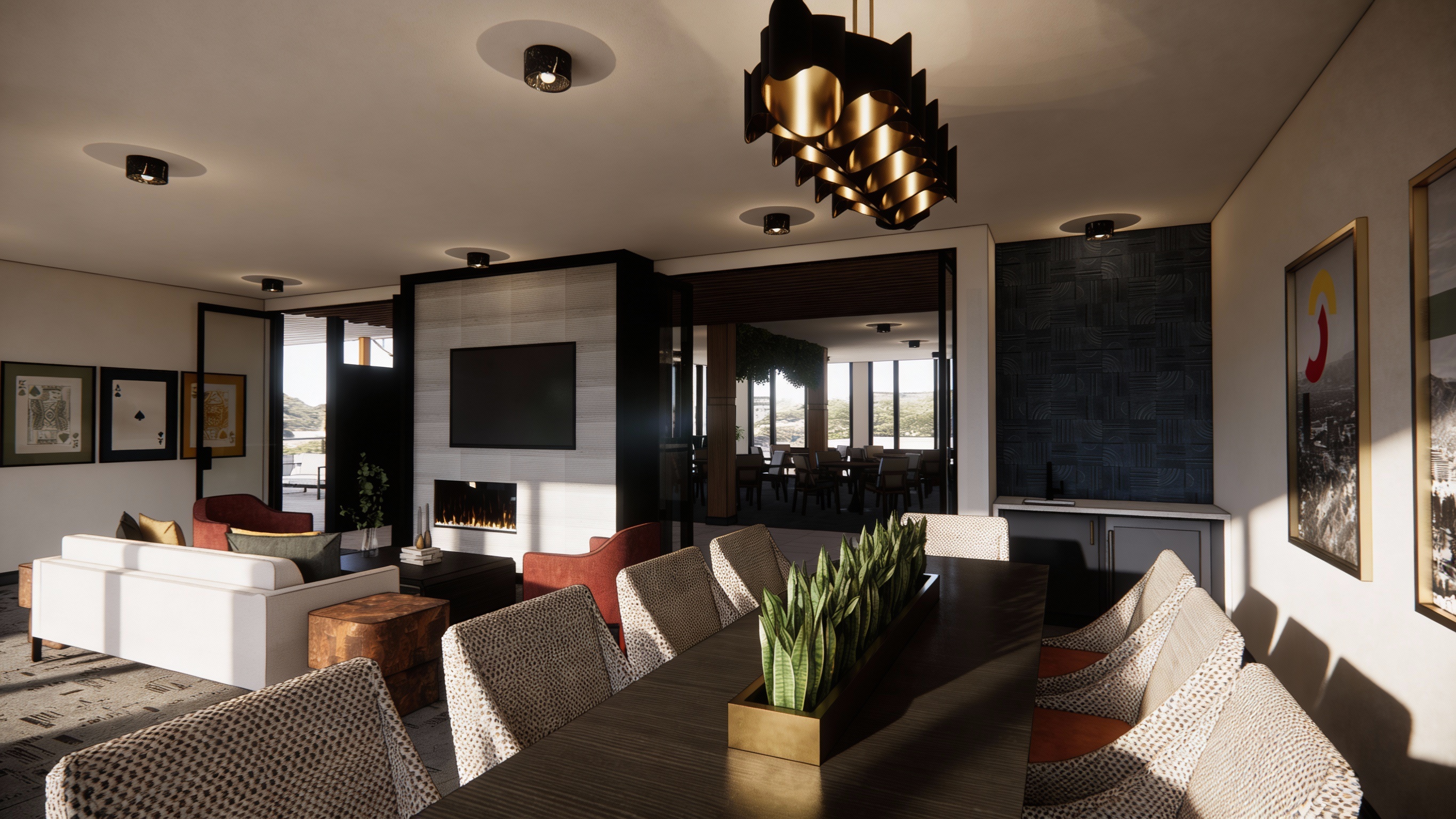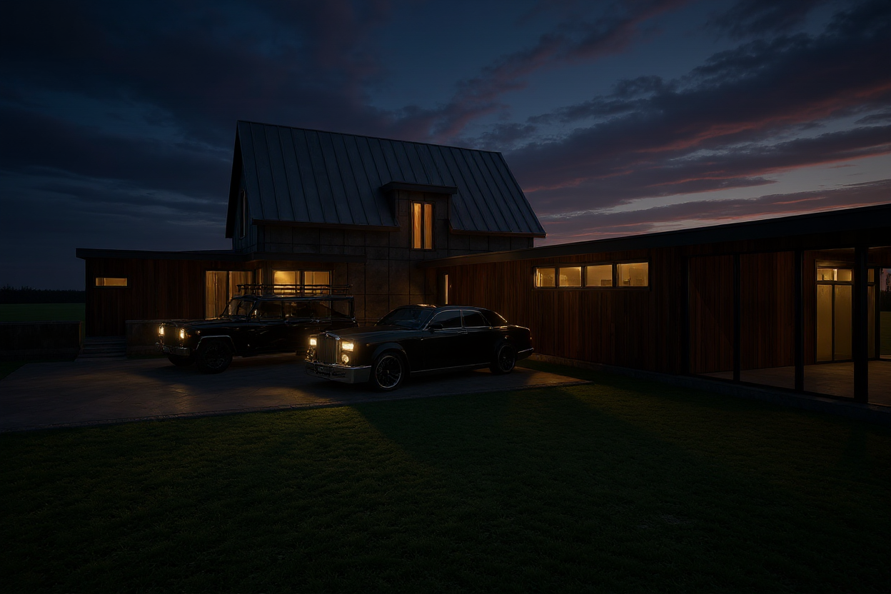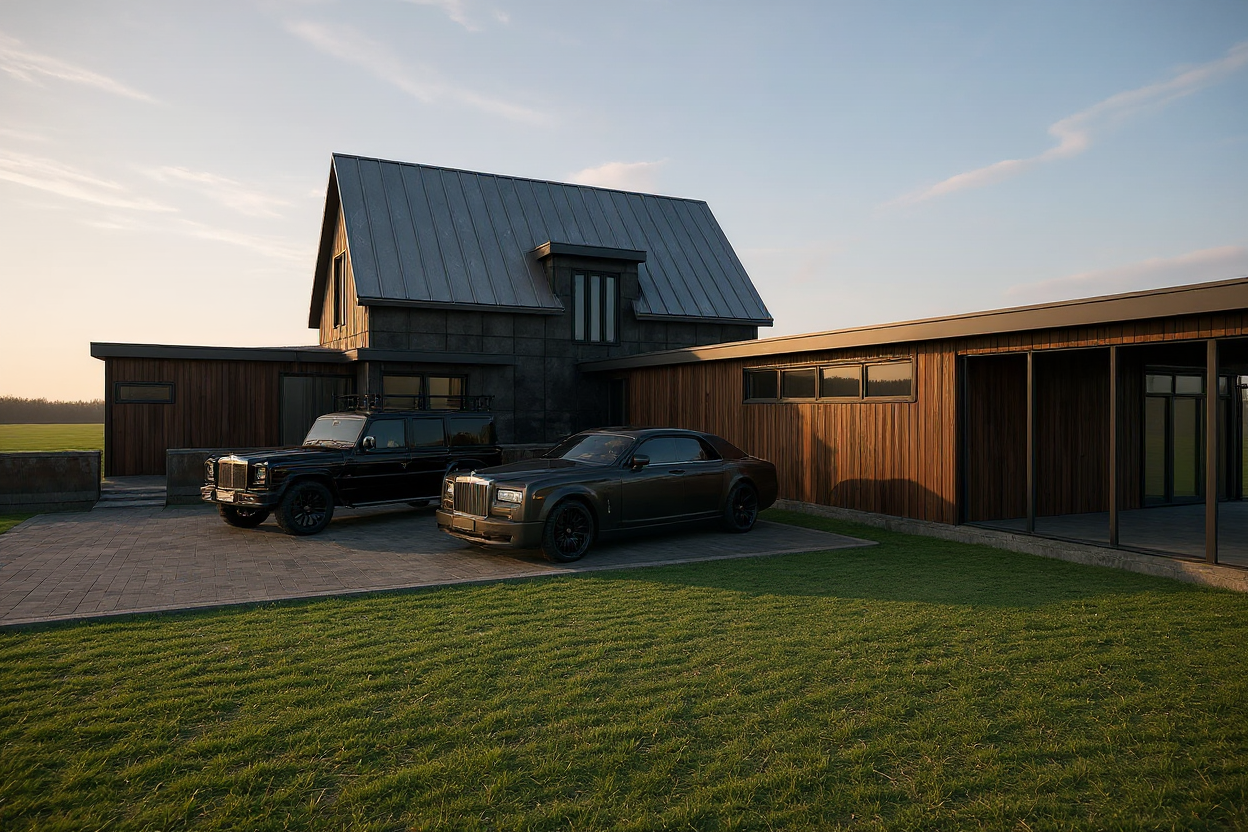 clean modern architectural exterior rendered in cinematic bright golden hour lighting stone siding under the gable ends horizontal cedar siding on rest of exterior grass foreground black standing seam metal roof visible prominent cinematic hills and trees landscape in the background natural wood textures high fidelity photorealistic visualization crisp shadow falloff refined facade geometry richly detailed grain patterns soft atmospheric depth premium architectural photography mood ultra clean composition and materials