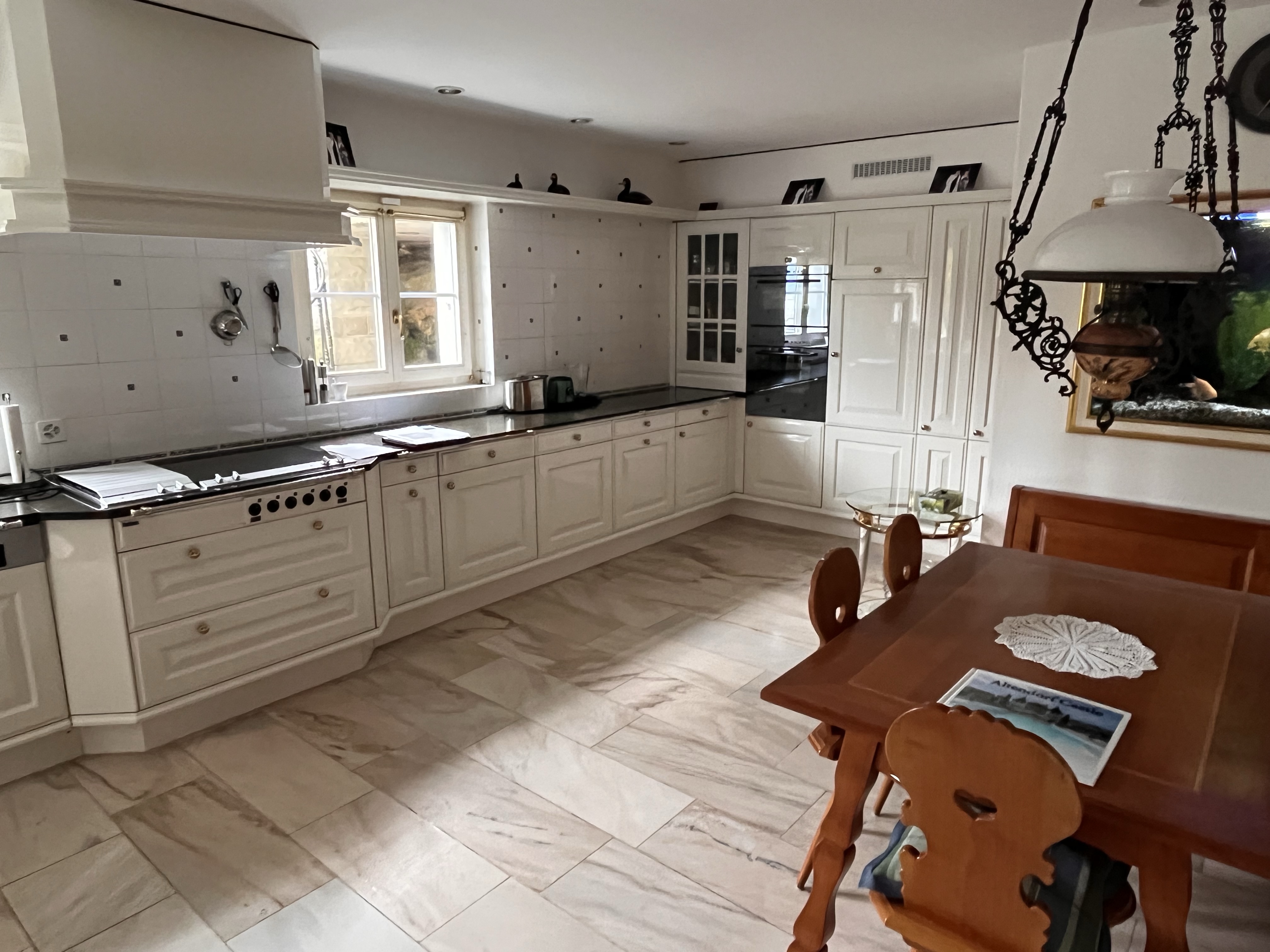 genau dieses rendering berarbeiten fotorealistisches innenraum foto exakt dieselbe perspektive und kameraposition wie das hochgeladene referenzbild 100 identische raumgeometrie exakt gleiche m belanordnung exakt identische fensterpositionen mit gleichem ausblick durch die fenster weiches nat rliches tageslicht leicht schr g einfallende sonne durch die grossen fenster geschlossene r ume k nstlich ausleuchten sanfte realistische schatten blickrichtung ist nach osten sonnenlicht kommt von s den ersetze den tisch mit einem sehr modernen esstisch aus holz mit designerst hlen ersetze die leuchte ber dem tisch mit einer modernen leuchte von occio ersetze die ganze k che mit einer sehr modernen europ ischen k che aus lackierten beigen fl chen und sch nem holz eiche dunkelbraun dunkelgraue granitabdeckung boden ebenfalls dunkelgrauer granit matt verbleibende w nde weiss ral 9016 belebe die szene mit europ ischen menschen um die 40 in alltagssituationen realistische materialien echte holztexturen stoff mit leichten gebrauchsspuren hochwertige oberfl chenreflexionen kleine gr npflanzen im raum alle fenster mit hellbeigen transparenten vorh ngen nat rliche farbwiedergabe leicht warme farbstimmung golden hour feeling das bild muss wie eine professionelle fotografie aussehen es soll ein echtes und reales foto sein canon eos r5 35 mm festbrennweite f 2 8 hyperrealistisch dslr qualit t raw aufnahme 8k aufl sung extrem scharf perfekte tiefensch rfe professionelle architekturfotografie