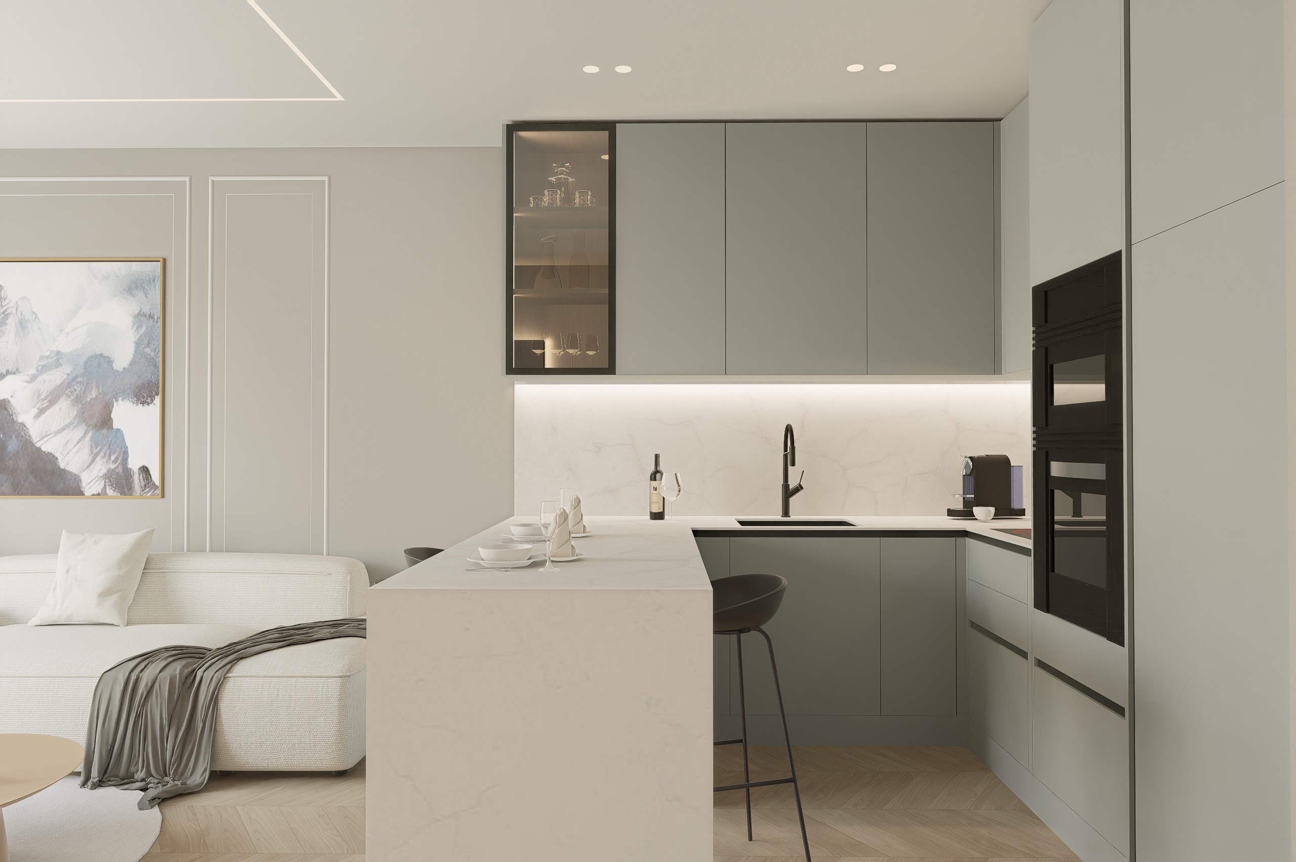 transform this render into an ultra realistic high end kitchen interior visualization while keeping the exact same layout cabinetry design island proportions appliance positions lighting setup wall details flooring pattern and camera angle unchanged do not redesign anything apply the same soft sage grey green matte finish to all lower and upper kitchen cabinetry matching the previous angle exactly the finish should be smooth matte lacquer refined and uniform with subtle light interaction no gloss no texture keep materials consistent and premium cabinetry sage grey green matte lacquer same tone as previous render countertop backsplash light warm white quartz stone with very subtle veining flooring light natural oak herringbone matte finish soft warm tone appliances modern black glass clean and minimal faucet sink matte black finish glass cabinet slightly tinted glass with soft warm internal lighting enhance realism with accurate soft reflections on painted surfaces realistic stone depth and micro texture natural wood grain variation and joints on flooring soft shadows under island and cabinetry warm subtle led strip under upper cabinets gentle glow inside glass cabinet lighting balanced 3000k 3500k warm neutral lighting soft ceiling spots with natural falloff indirect lighting for depth no harsh contrast no overexposure keep styling minimal and clean no added clutter just what already exists render as a photorealistic architectural image ultra detailed materials calm luxury aesthetic clean modern interior negative prompt do not change design do not change layout do not change island size do not change camera angle no glossy cabinets no color shift from sage green no dark wood tones no oversaturation no clutter no redesign no unrealistic lighting