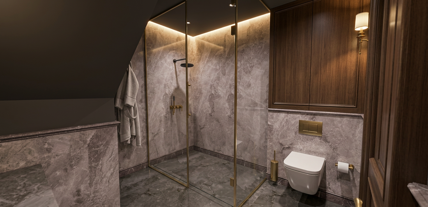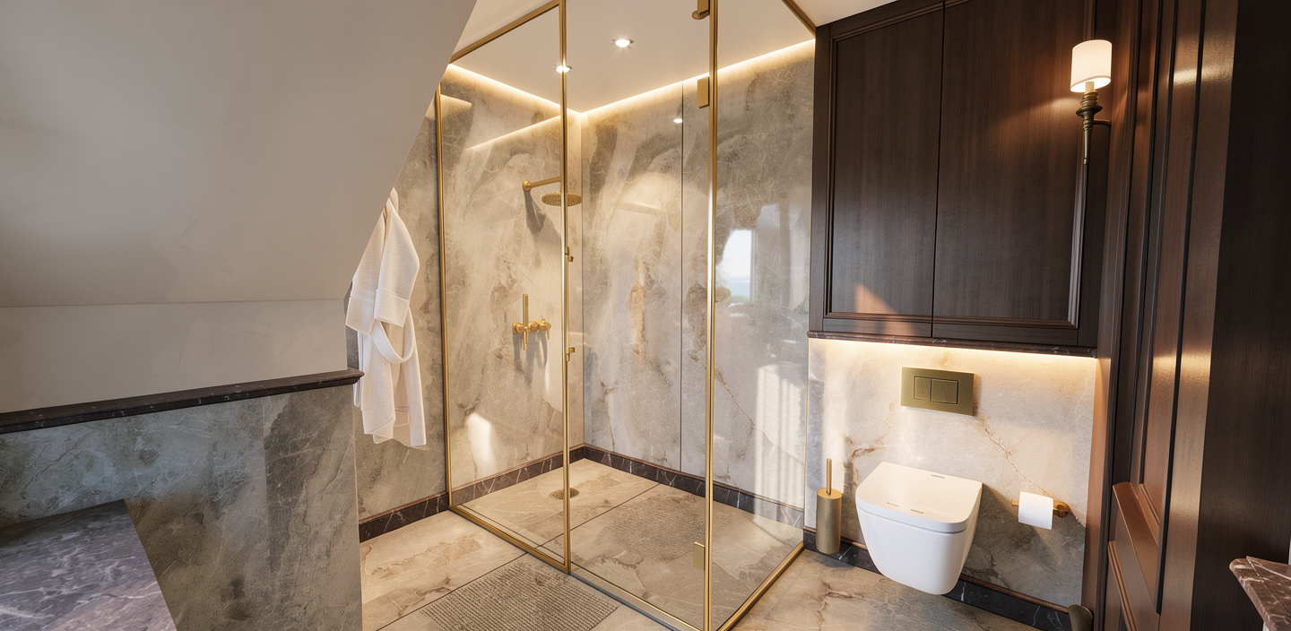 enhance the lighting atmosphere only adjust only the lighting use natural cinematic lighting soft shadows realistic global illumination and subtle light contrast to create a warm atmospheric scene on the cabinet in the center the doors should have a simple straight vertical gap only do not add any cutouts decorative elements or drawers enhance the lighting atmosphere only adjust only the lighting use natural cinematic lighting soft shadows realistic global illumination and subtle light contrast to create a warm atmospheric scene change only the cabinet doors in the center so that they are completely flat and straight do not add cutouts handles decorations or drawers enhance the lighting atmosphere only adjust only the lighting use natural cinematic lighting soft shadows realistic global illumination and subtle light contrast to create a warm atmospheric scene materials and colors in the bathroom should be as follows walls and floor gray microcement sink and bathtub white cabinet under the sink dusty pink staroru ov cabinet above the sink mirrored window above the bathtub white glass enhance the lighting atmosphere only adjust only the lighting use natural cinematic lighting soft shadows realistic global illumination and subtle light contrast to create a warm atmospheric scene materials and design in the bathroom should be as follows walls and floor gray microcement smooth and seamless with no tiles or grout lines sink and bathtub white cabinet under the sink dusty pink staroru ov cabinet above the sink fully mirrored completely reflective on all surfaces window above the bathtub single pane white glass not divided do not change any other geometry layout or architectural elements preserve all other surfaces objects and materials exactly as they are