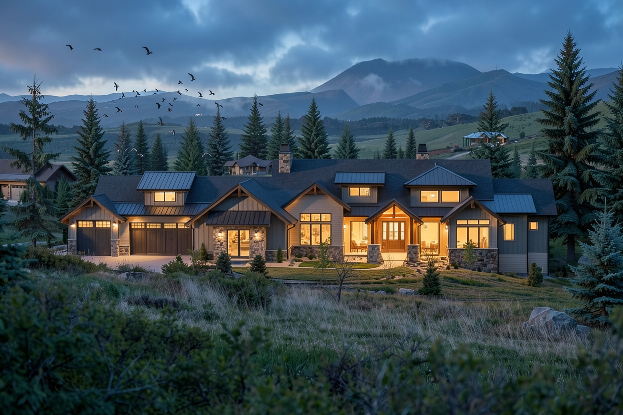 render a stunning image of a modern wooden cabin with a sloped roof nestled among natural rocks and sparse greenery the cabin features an open front with large glass panels showcasing warm inviting interior lights that create a cozy atmosphere use earthy tones for the wood such as rich browns and deep reds contrasting with the natural stone foundation in shades of grey and beige capture the soft glow of the interior lights and exterior lanterns in warm yellows and oranges set against a serene overcast sky in muted blues and grays emphasize the tranquil and cozy atmosphere of a peaceful retreat in nature