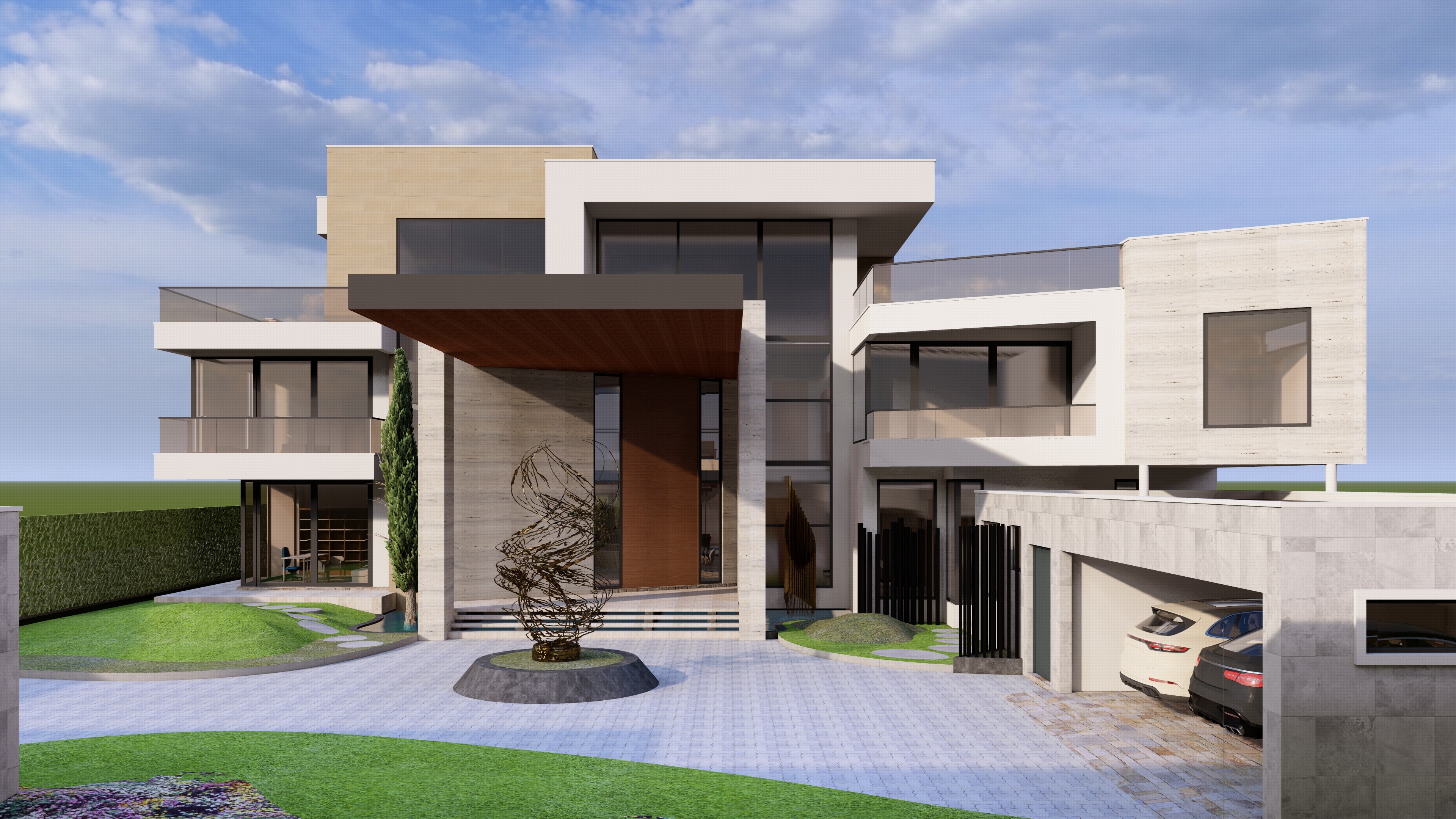 image of modern maisonette add few trees in far far background for context add very few vegetation including very very few floral ones for context as well make scene look lived in there should not be any haziness or excess strength from the sun light or sun rays