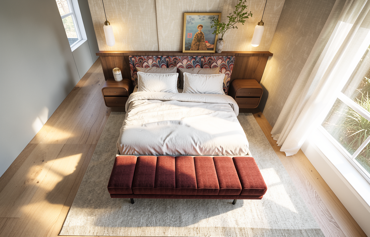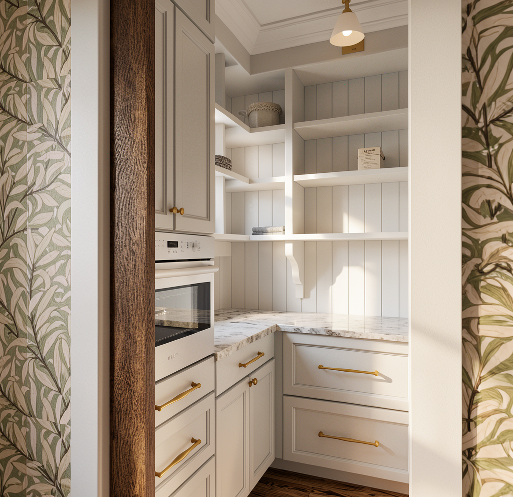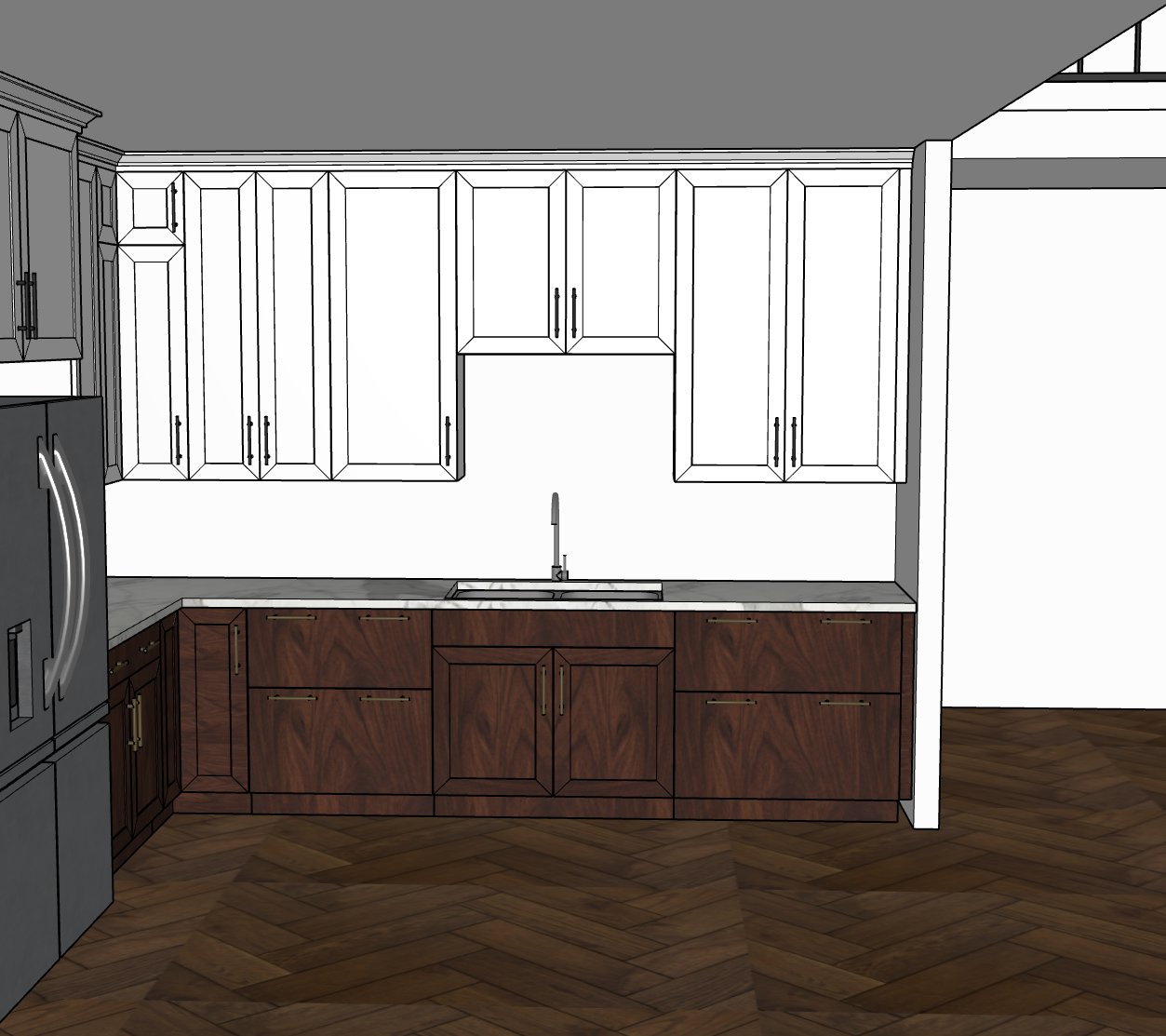 this is a gorgeous kitchen with white upper cabinets that go all the way to the ceiling with nice modern 2 step crown all the base cabinets are made of a natural stained walnut all the cabinets have brushed brass handles the kitchen has white marble countertops the floor is a beautiful hardwood the kitchen is flooded with natural light coming from behind the camera all appliances are modern stainless steel