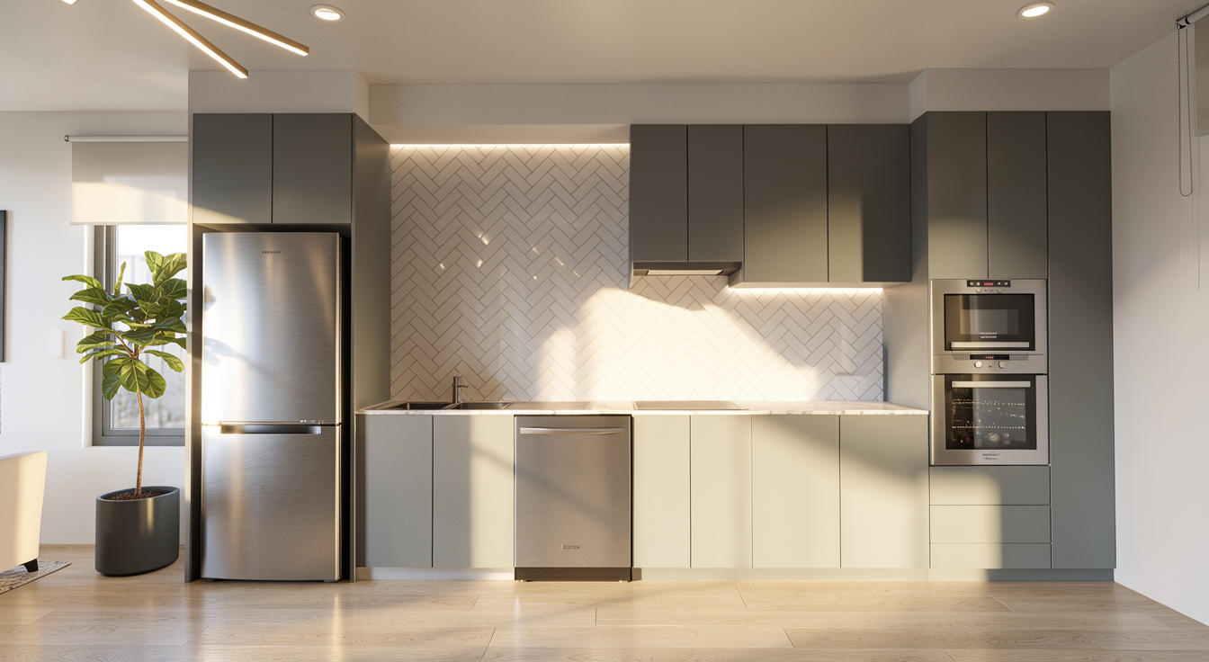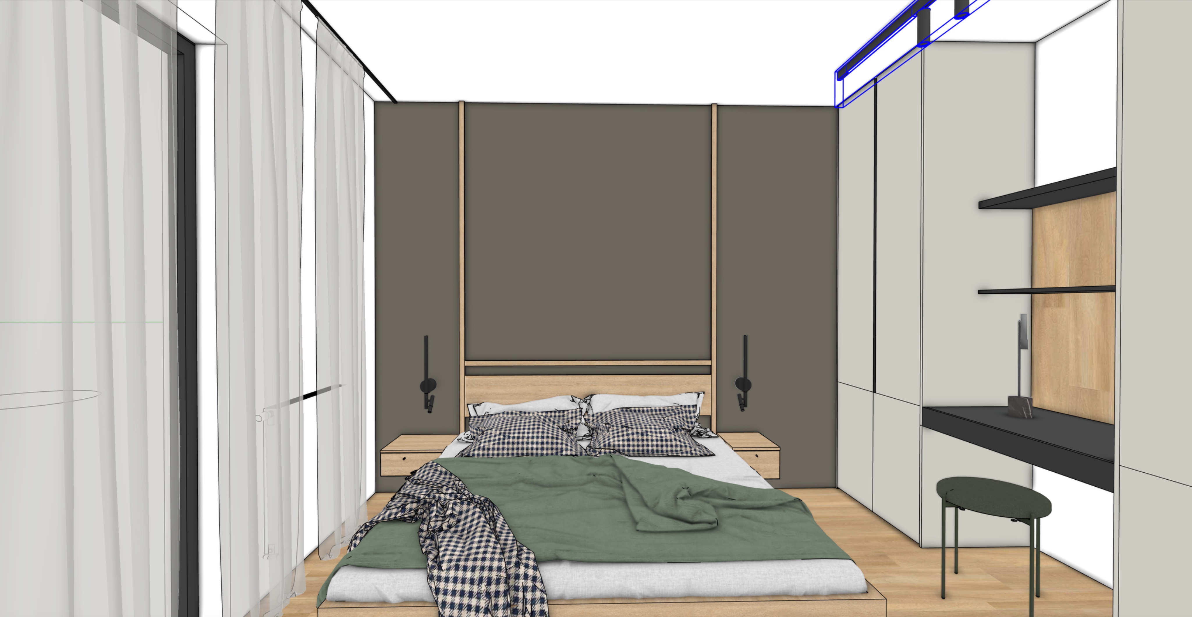 bedroom modern style daylight with soft shadows wardrobes in matt grey beige finish
