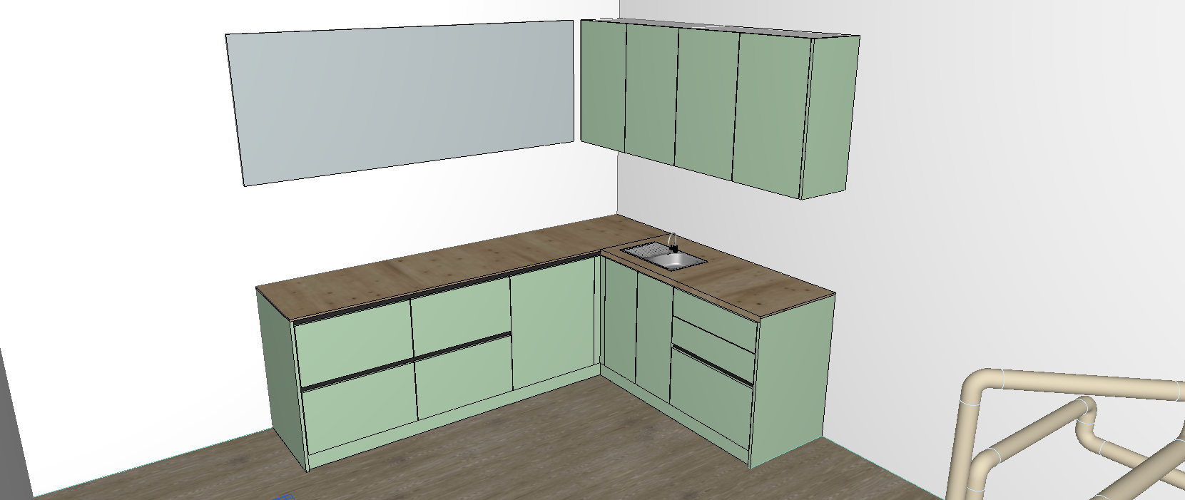 transform this archicad interior into a highly realistic photorealistic render while strictly preserving the original layout furniture design dimensions materials placement and all architectural details do not redesign do not add new elements and do not change the composition keep everything exactly as modeled only enhance realism this scene includes a compact kitchen and a small waiting area the kitchen cabinets should remain a light soft green color with a clean modern matte finish the worktop should remain in natural wood warm and realistic preserve the exact cabinet arrangement upper and lower units sink position and all original lines the small wai