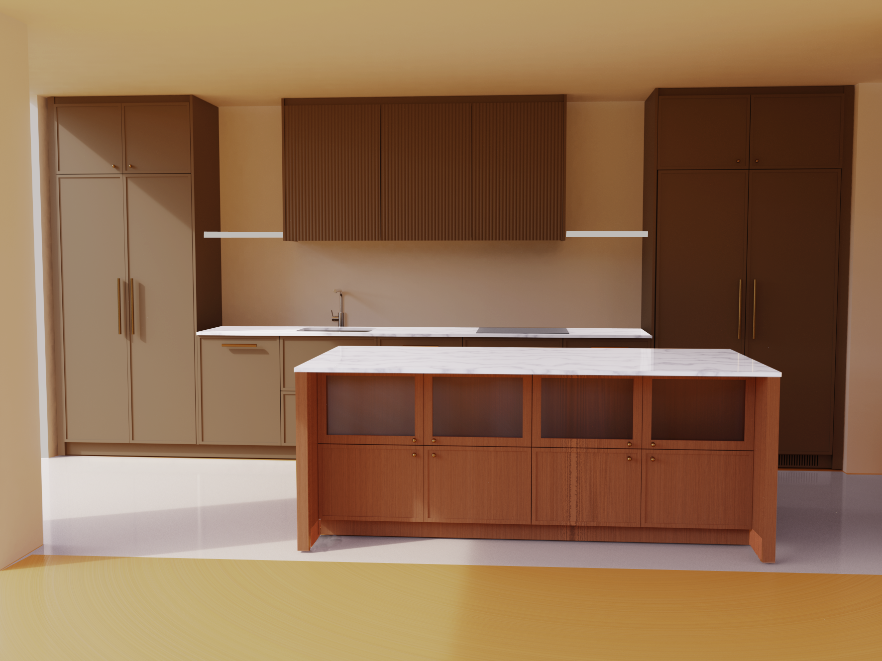 dark brown painted kitchen including wall cupboards with walnut island with reeded glass doors at top marble splashback light oak floor to front of camera