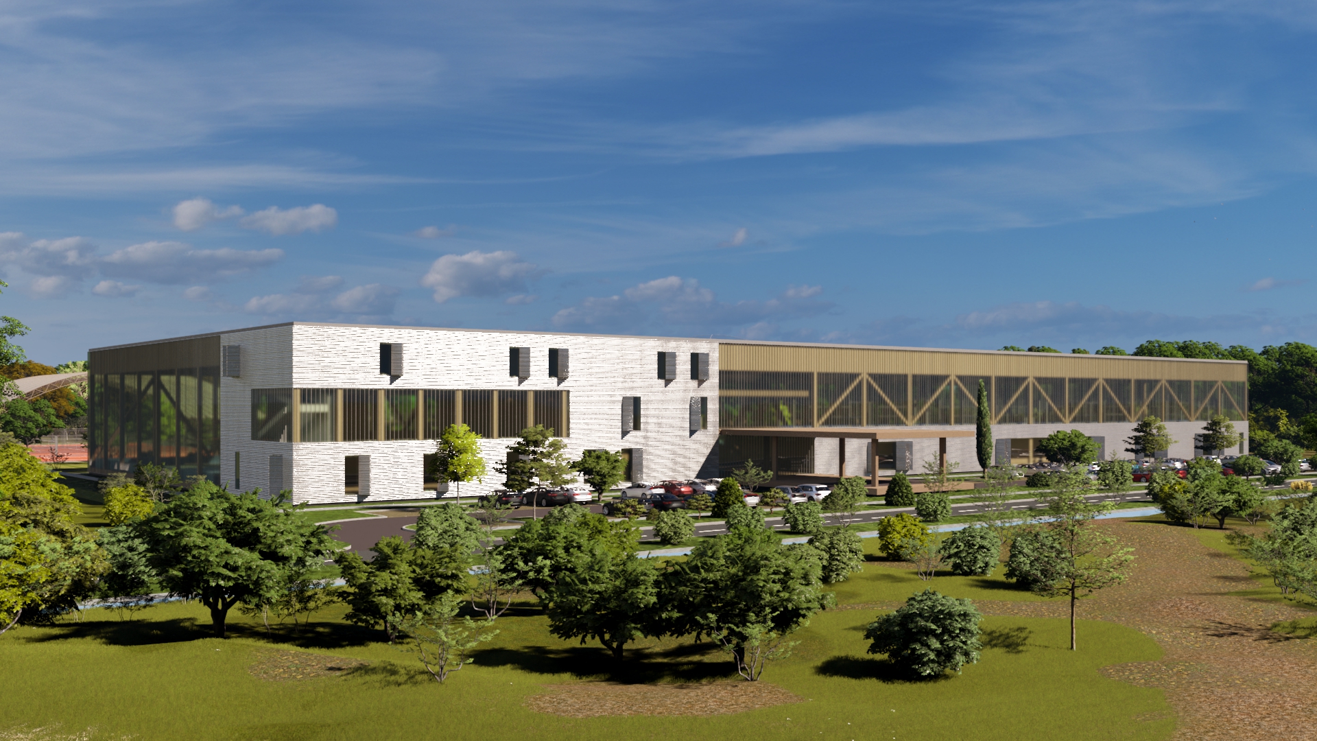 canon eos 5d archdaily style ultra realistic many details daylight lighting effects award winning stylize 750 calm and natural with sun beaming keep material on the building the same add people in the distance