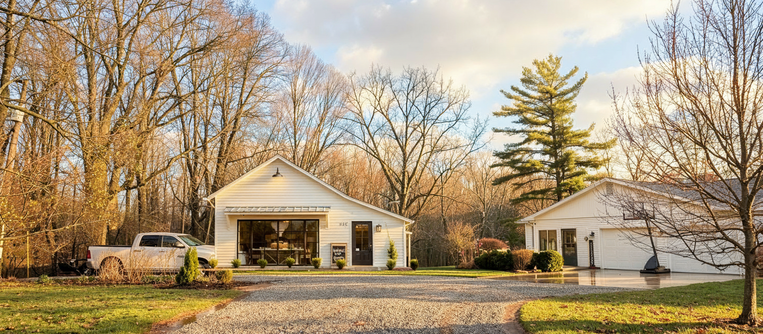 remove the lettering above the overhead garage door on the building to the left make the overhead garage door a solid white panel garage door