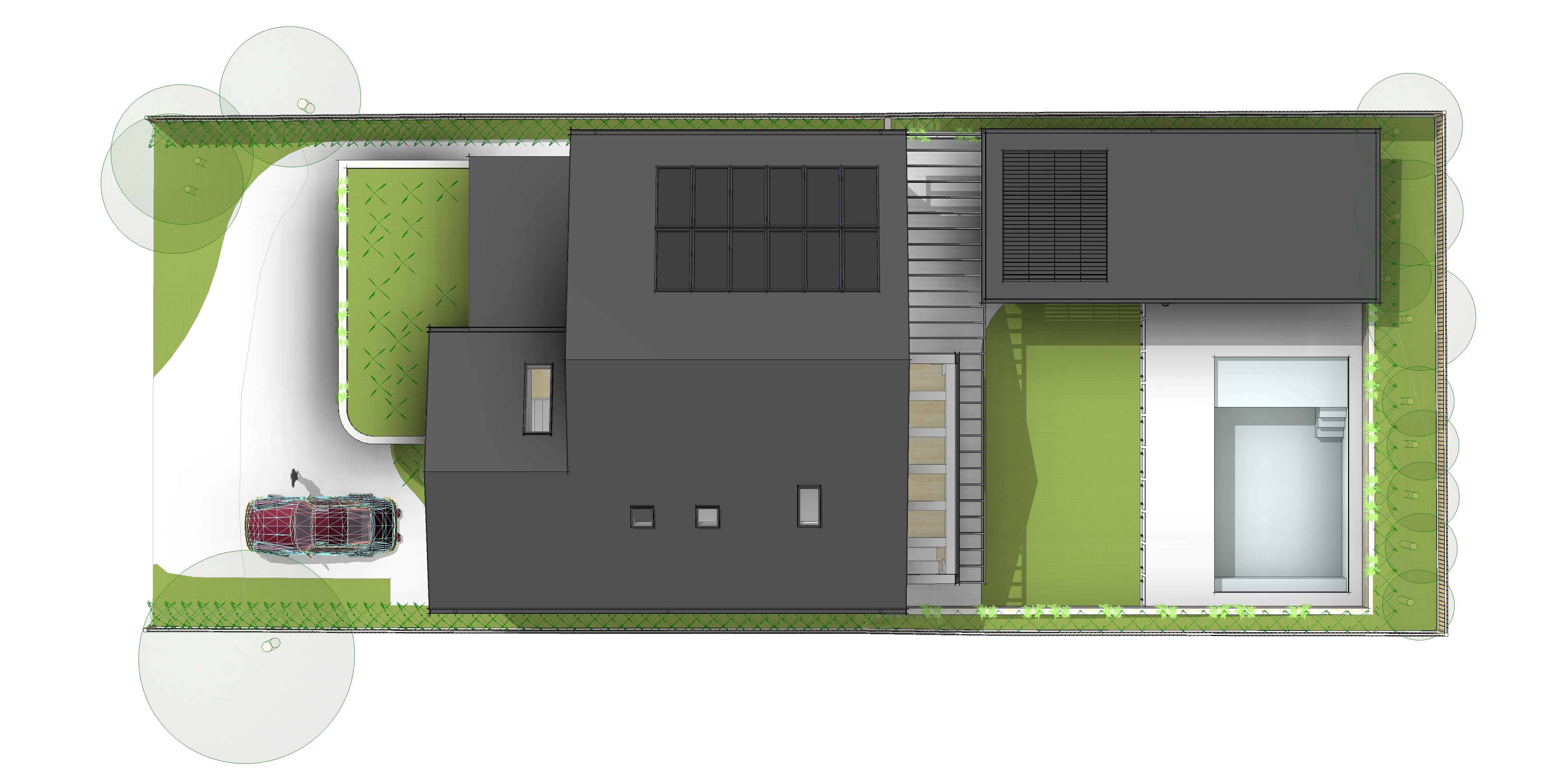 render a photorealistic 3d perspective of this house near sydney reference the current material style and enhance them white metal roof linea fibre cement cladding and sandstone walls keep model geometry the same windows doors roof walls garage door pavement driveway make a lush vegetation that looks native to australia do not change the view only enhance the current materials and make the landscape nicer vegetation detailed textures in the grass and glass reflections and a vibrant clear sky with light atmospheric depth render in hyper realistic architectural visualization quality 8k resolution