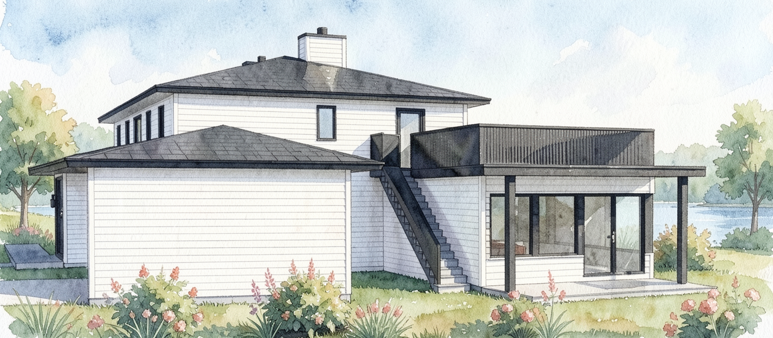 design ultra modern barn style house from two pavilions 6 meters wide and 18 meters long with a solid joining link