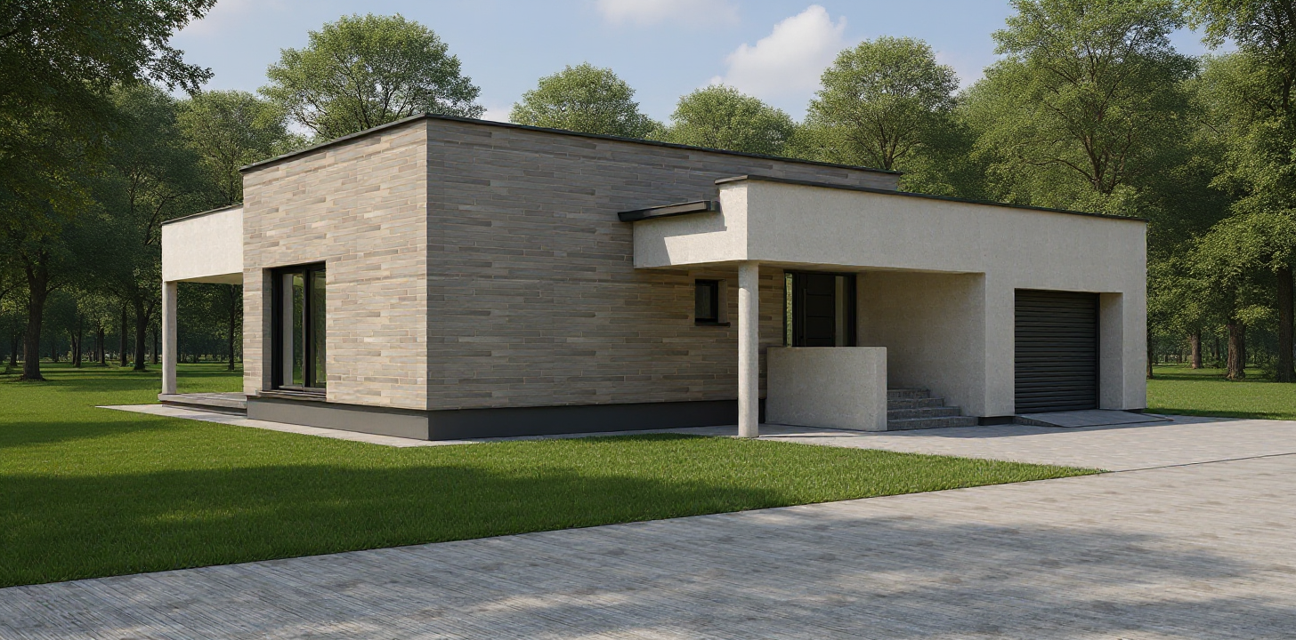render this as a brick building with dark shingles make the building in an urban environment